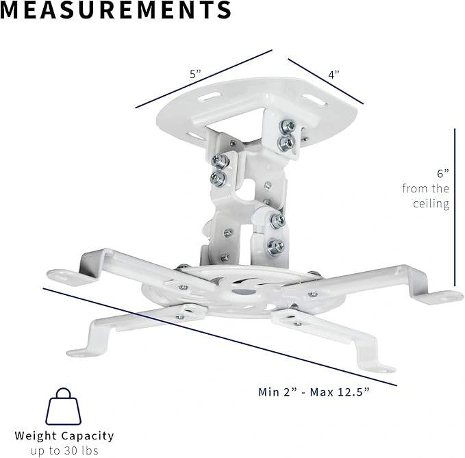 Selling a fully adjustable projector ceiling mount! It's designed to fit projectors with either 3 or 4 mounting holes. It can tilt +15° to -15°, swivel +15° to -15°, and rotate 360° for the perfect viewing angle. The longest distance between mounting holes must be 5.25" to 12.5". It can be mounted 6" from the ceiling and has a weight capacity of up to 30 lbs