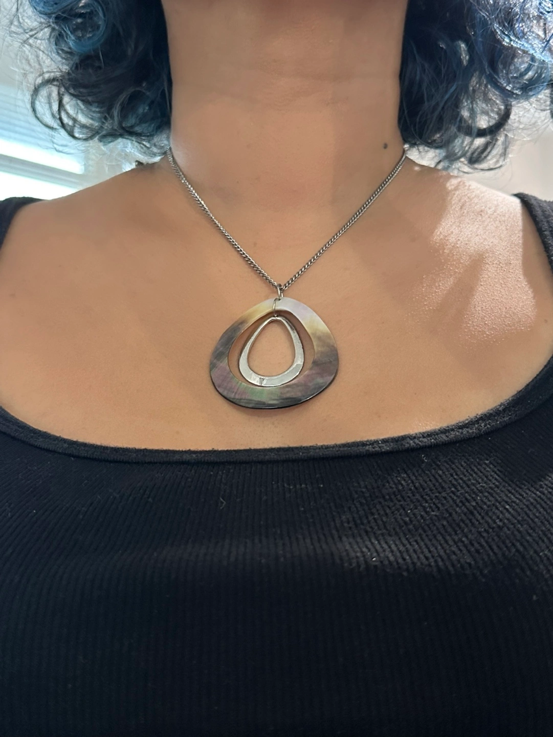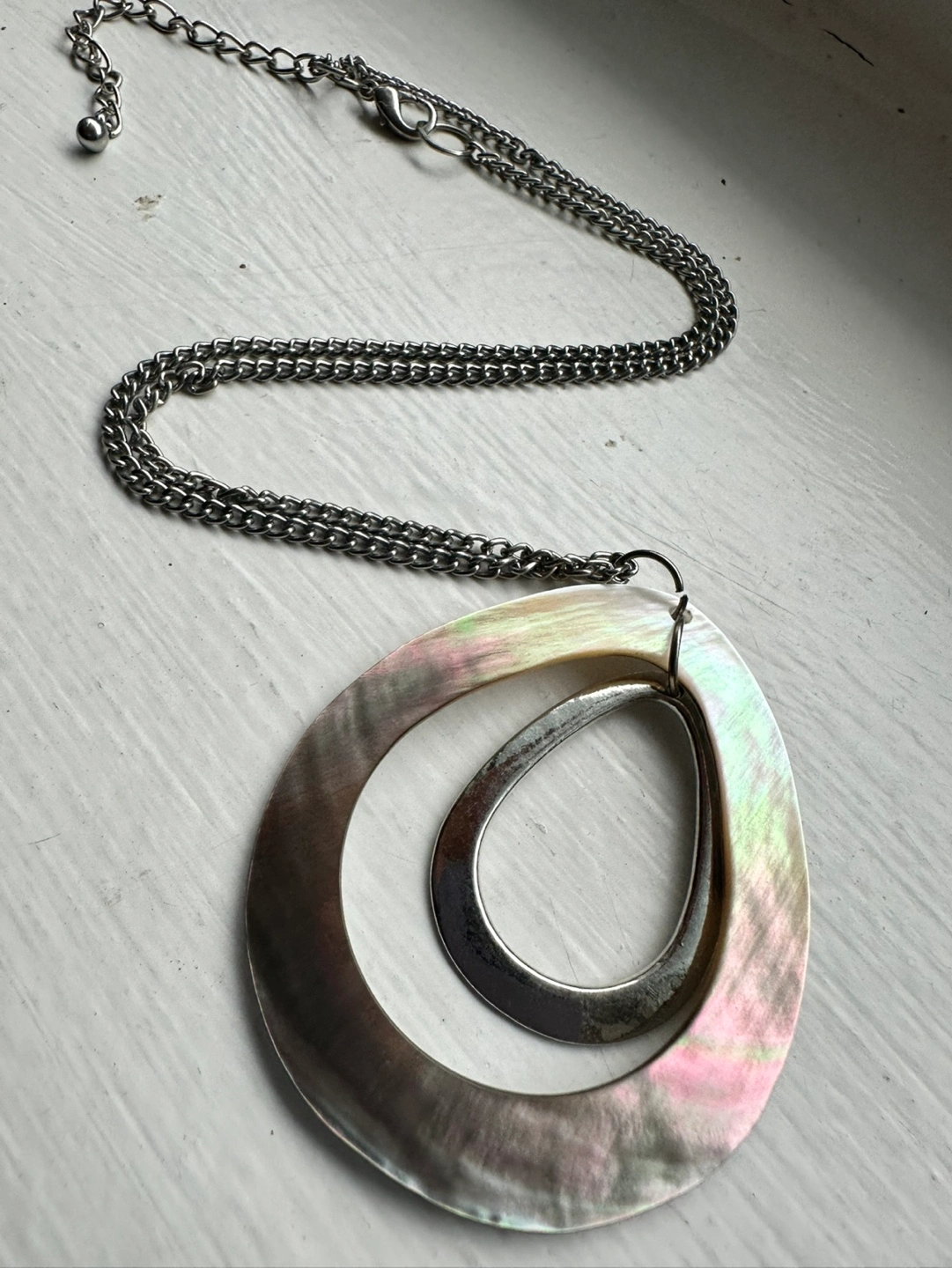 Stunning statement necklace. Features a large iridescent shell pendant with a silver inner teardrop. Silver chain, so length. Elegant and eye-catching.