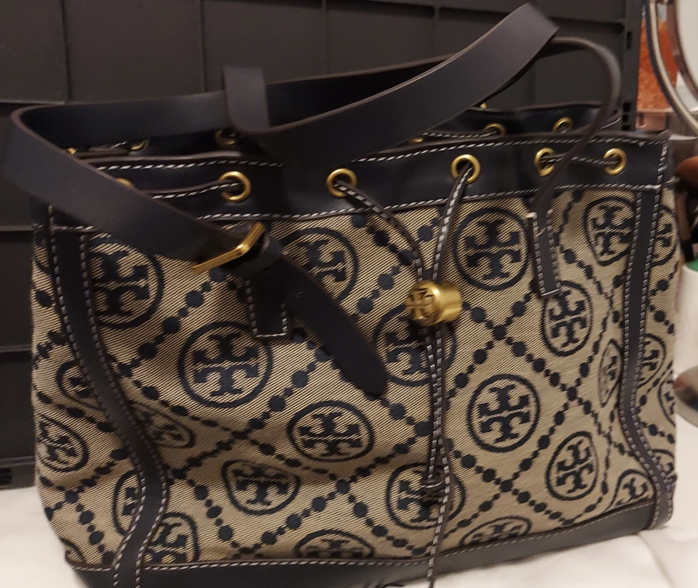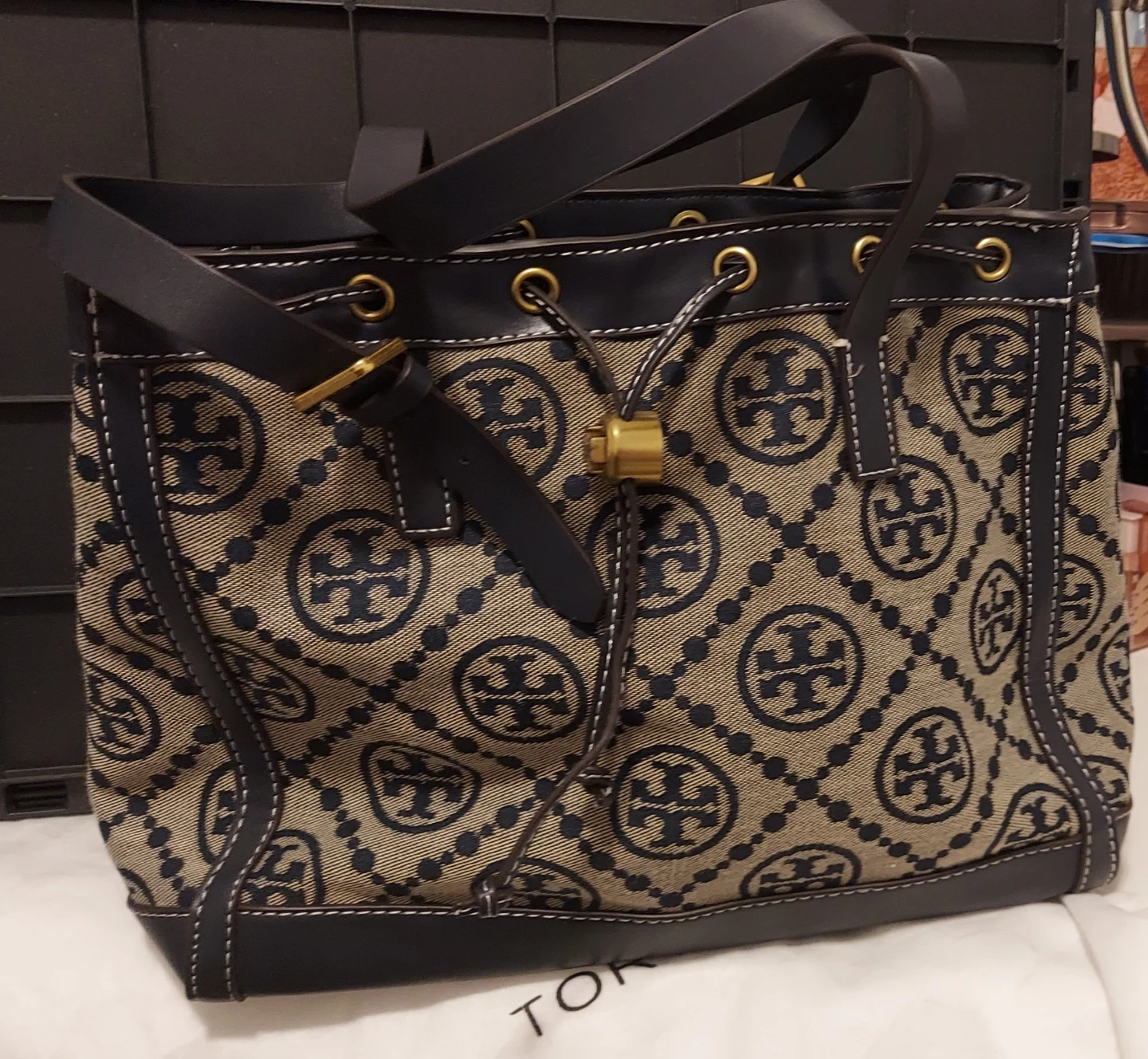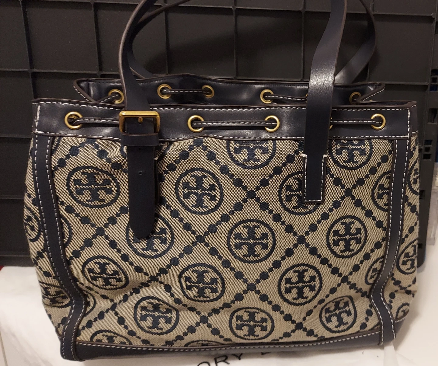 Tory Burch tote bag with signature logo pattern. Interior features a zip pocket and additional slip pockets. Leather trim and handles.