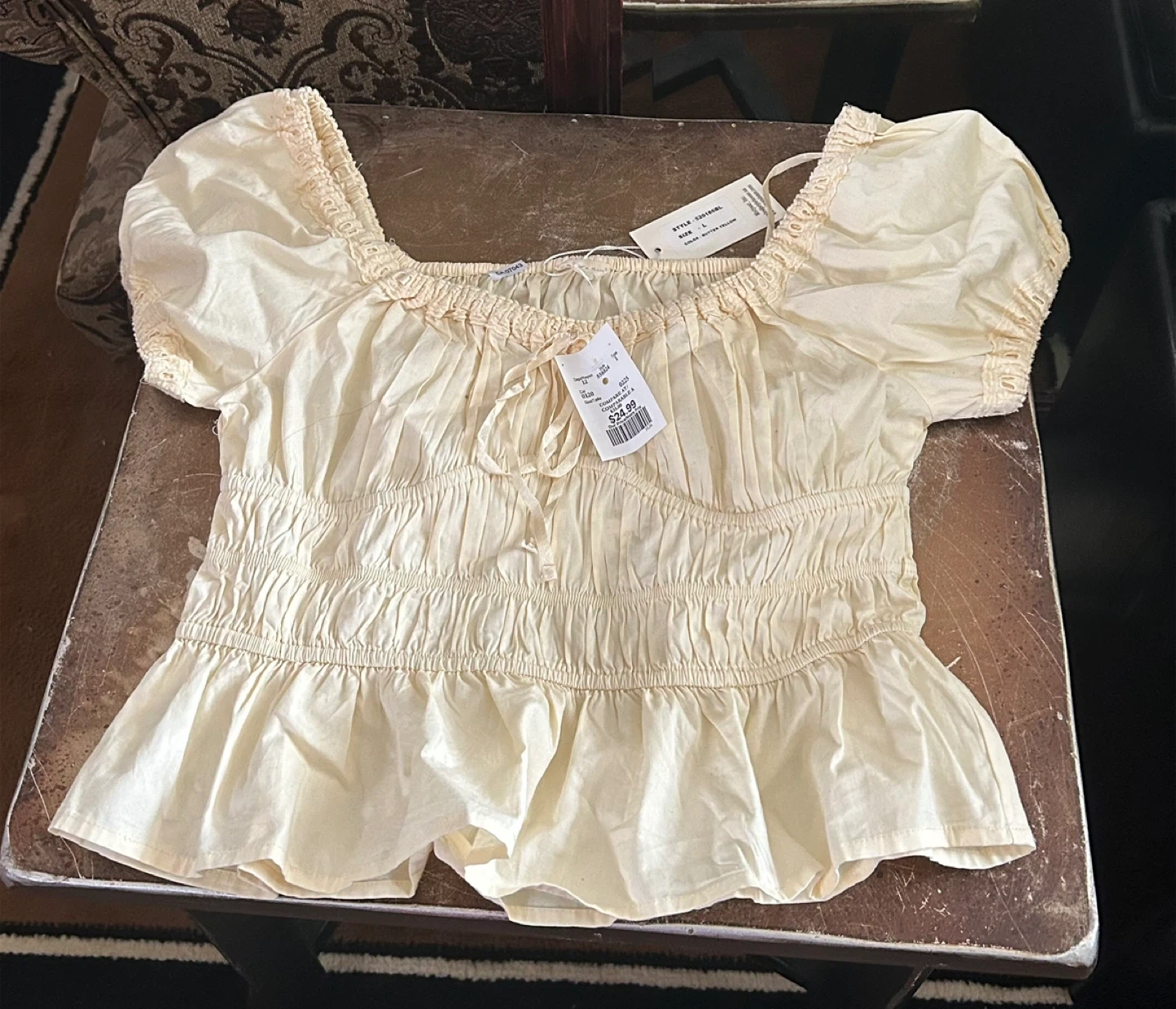 This Sim & Sam light yellow top is brand new still has tags on and is a size L. It features a smocked bodice and puff sleeves. The fabric is lightweight and suitable for warmer weather. It is made from 100% cotton