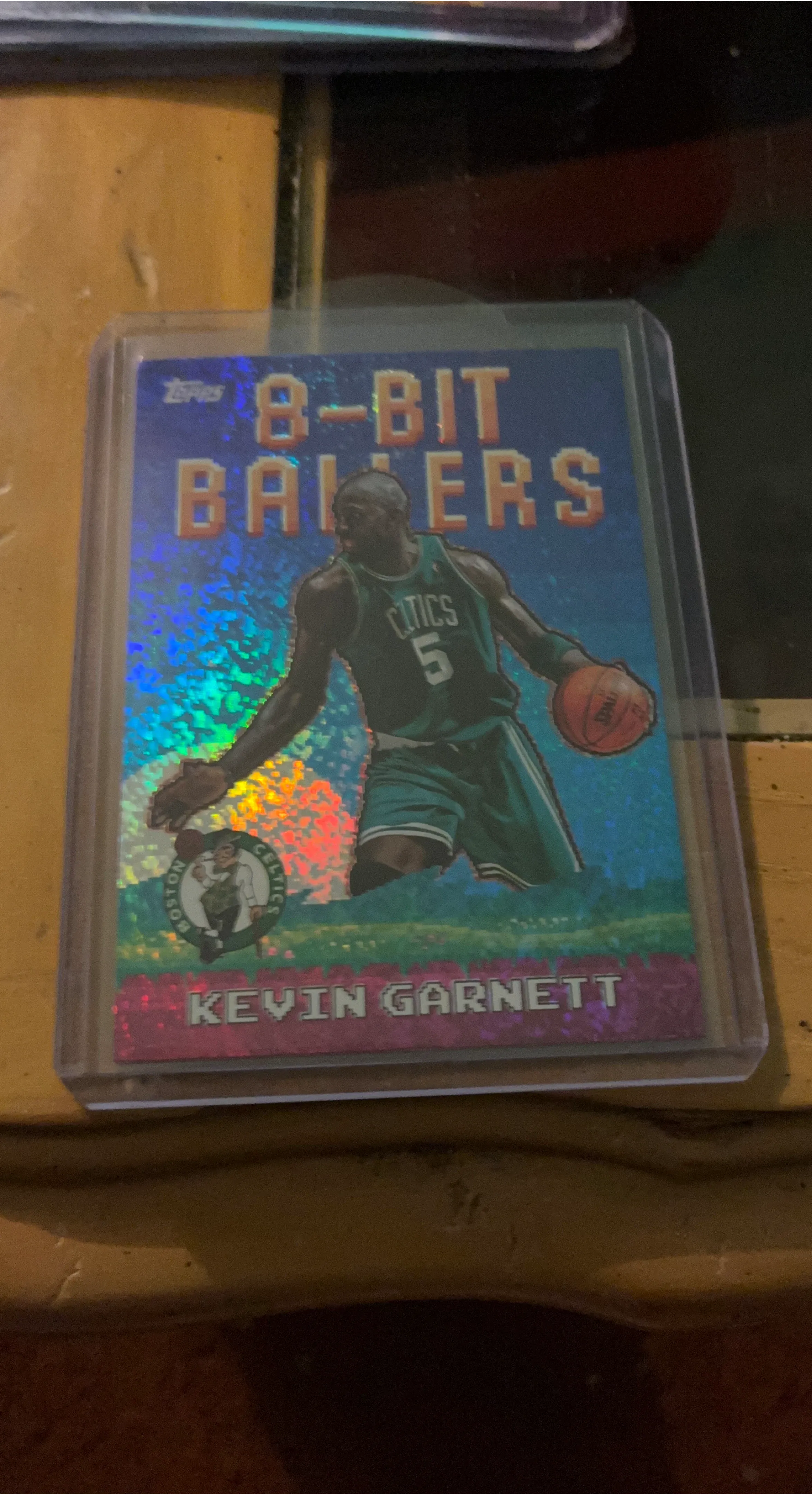This is a Topps 8-Bit Ballers basketball card featuring Kevin Garnett. It has a holographic finish and displays the Boston Celtics logo.