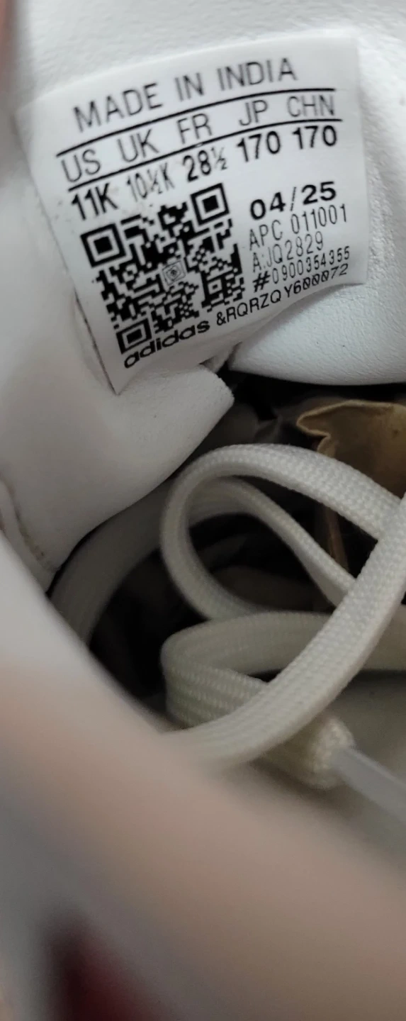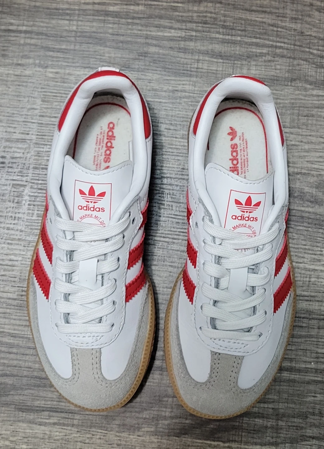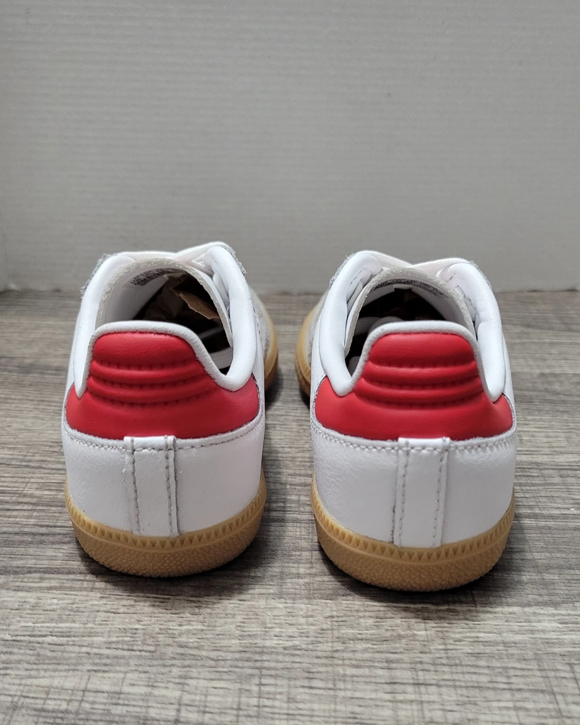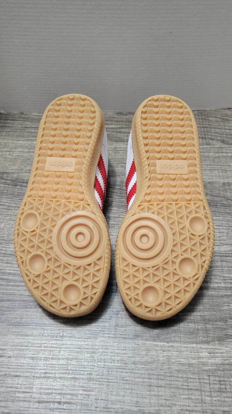 Adidas Samba sneakers in white with red accents. Features the classic three stripes and gum sole. Made in India. Size 11K.
