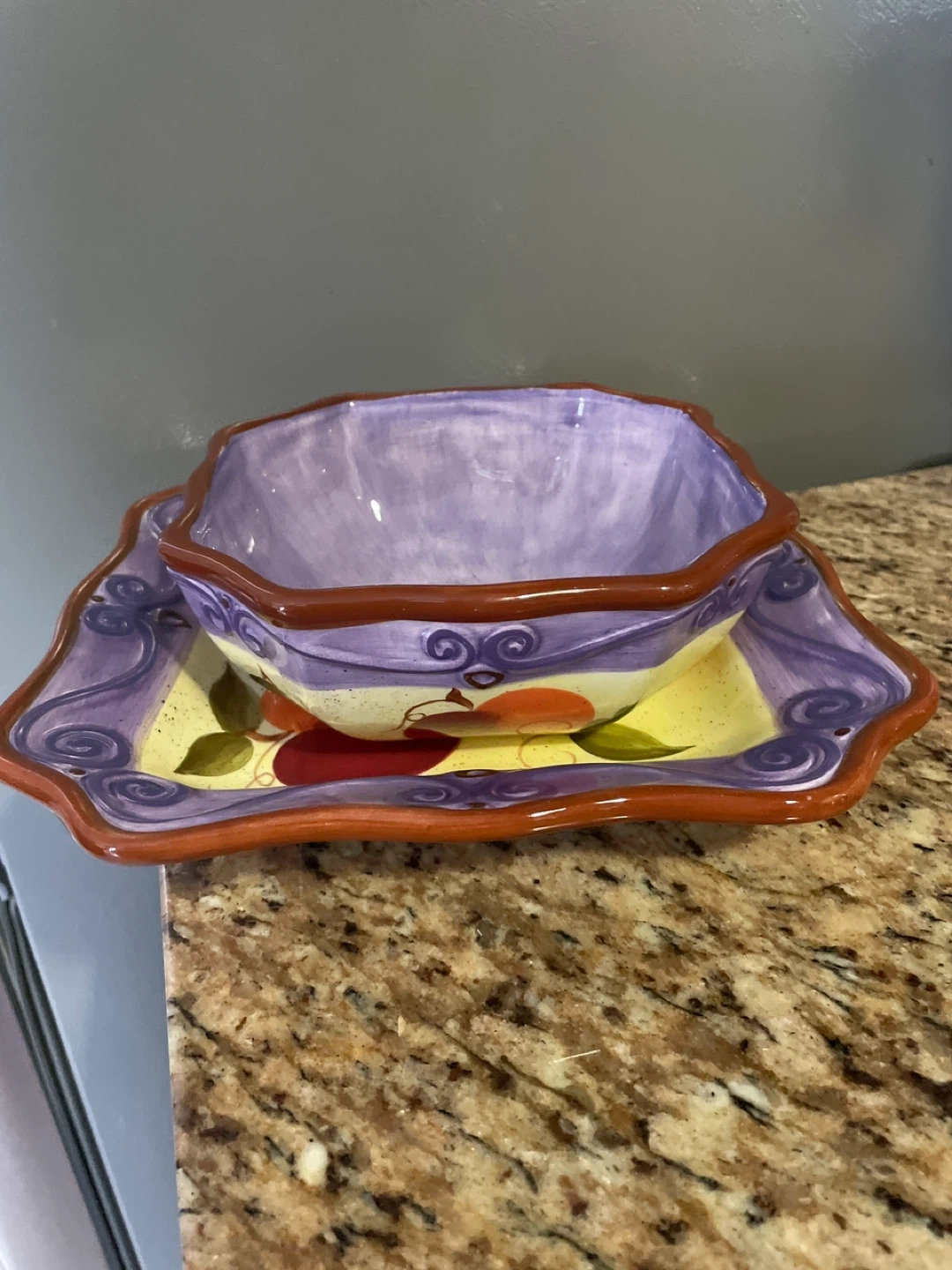 Selling a charming bowl and plate set from Tabletops Gallery, featuring the Medici design! The set showcases a delightful fruit pattern with vibrant oranges, grapes, and plums, complemented by a lovely purple trim. Perfect for adding a touch of whimsy to your table setting