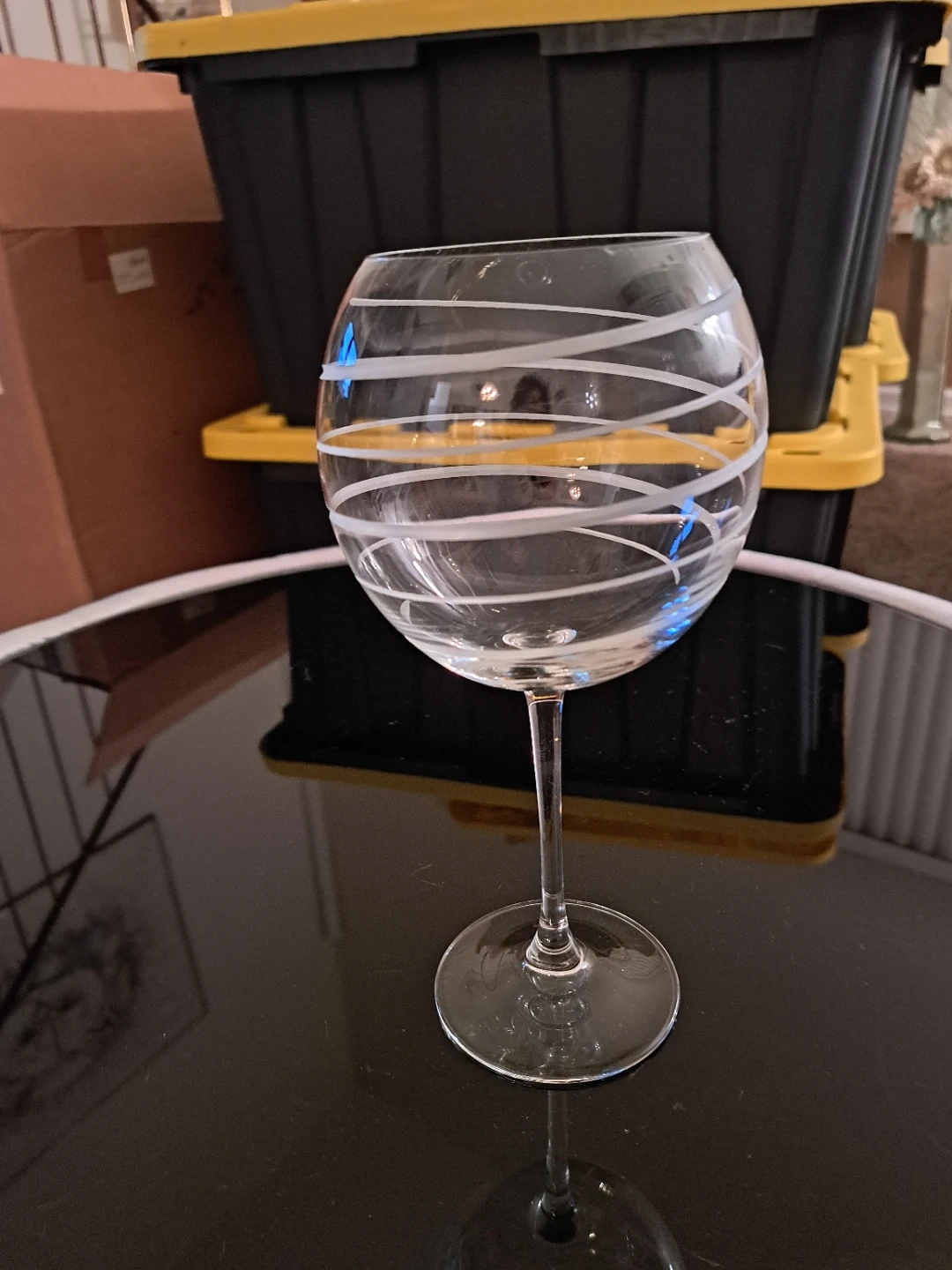 This is a clear wine glass with a white swirl design. It's made of glass. Perfect for enjoying your favorite beverages!