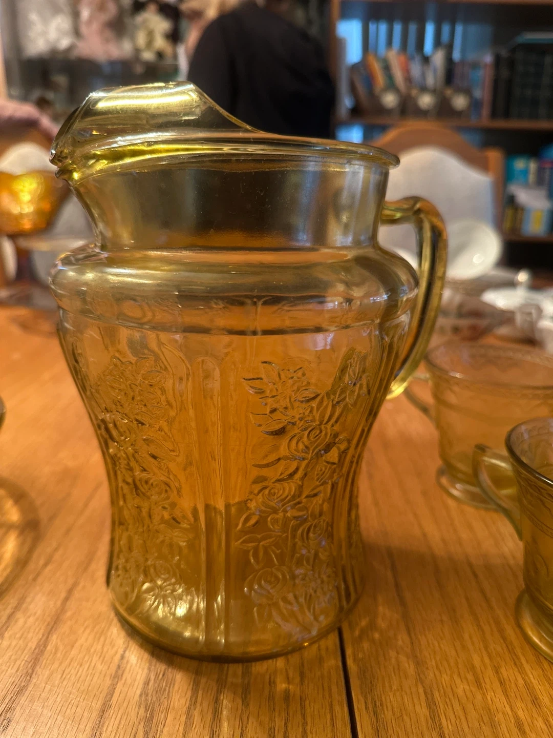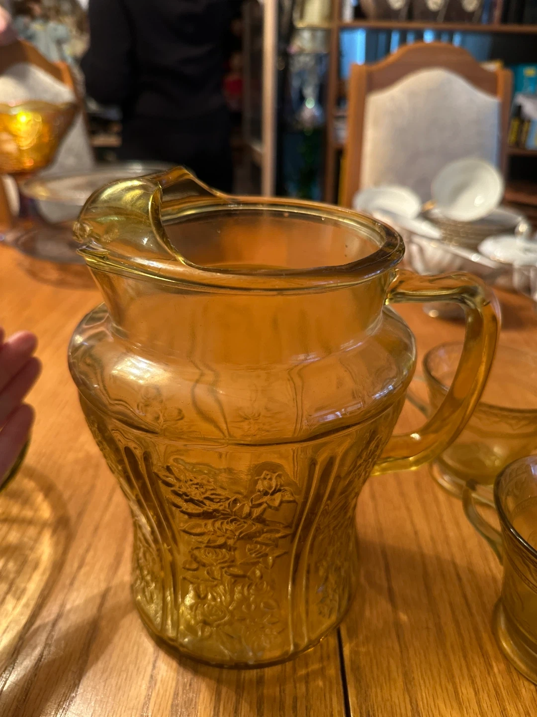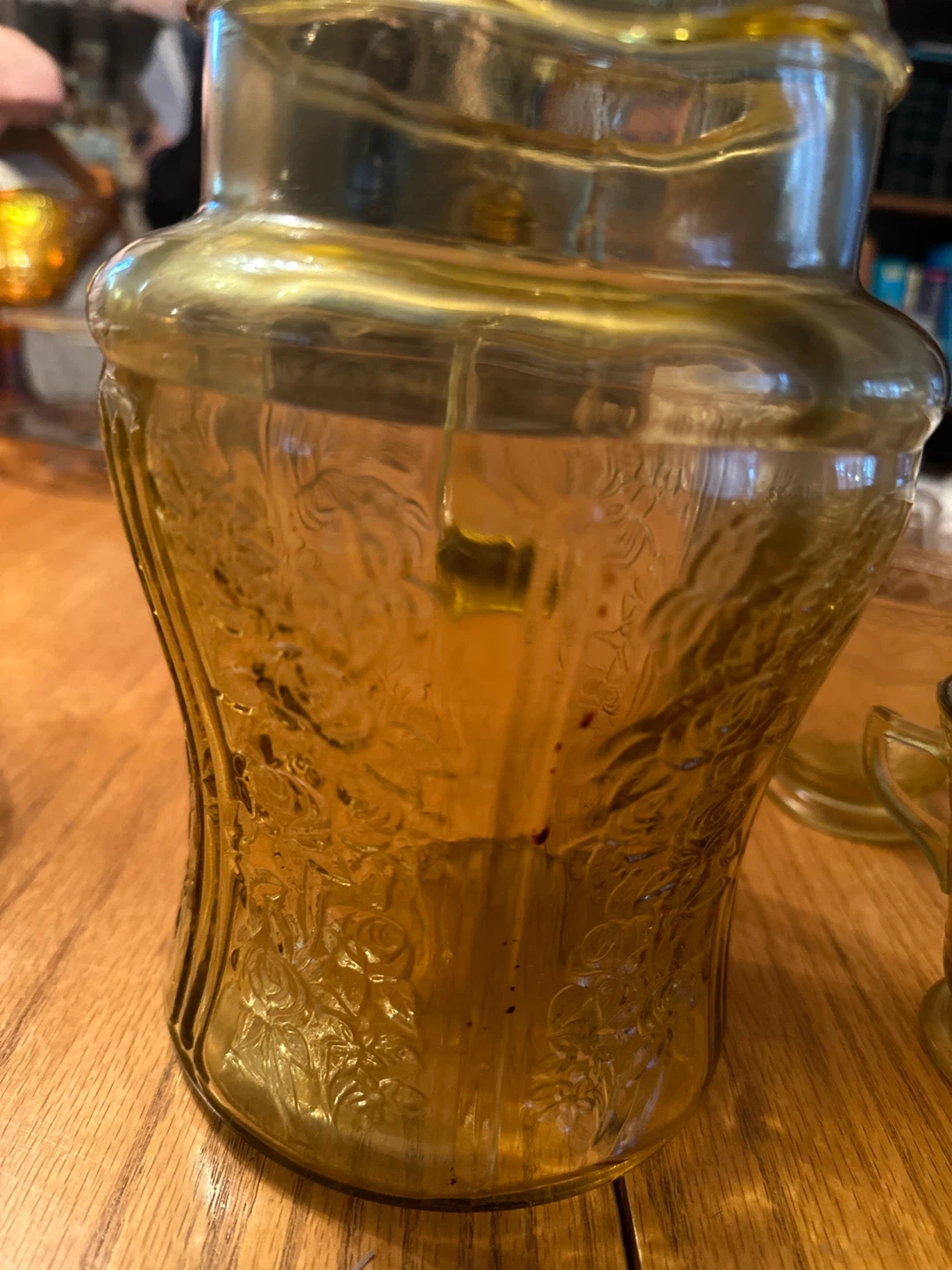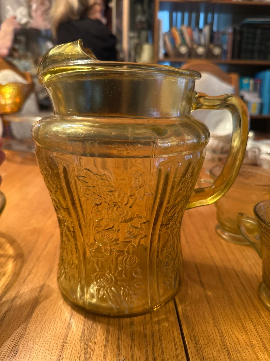 Selling a lovely vintage Sharon cabbage rose 80 ounce depression glass pitcher with sugar and creamer. The set has a beautiful floral design. Perfect for adding a touch of retro charm to your table!
