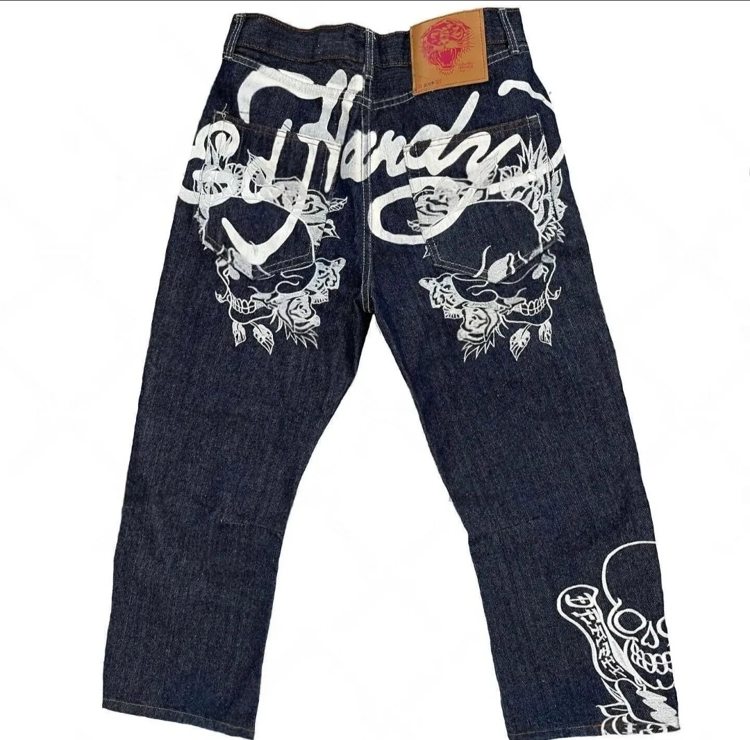 Dark wash denim jeans with iconic Ed Hardy skull and rose graphic print on the back and leg. These jeans feature a stylish design perfect for making a statement. Cotton material for durability.