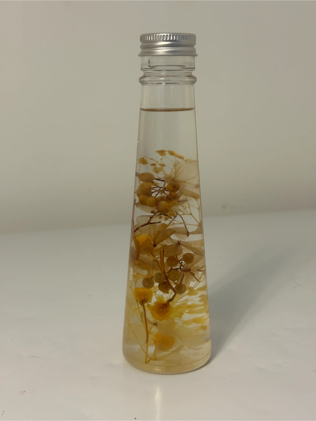 This is a clear glass bottle filled with preserved dried flowers and small berries. The bottle has a silver metal cap. It's a decorative item.