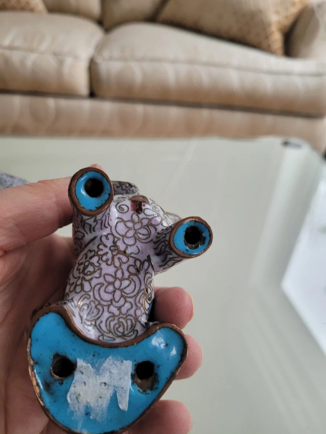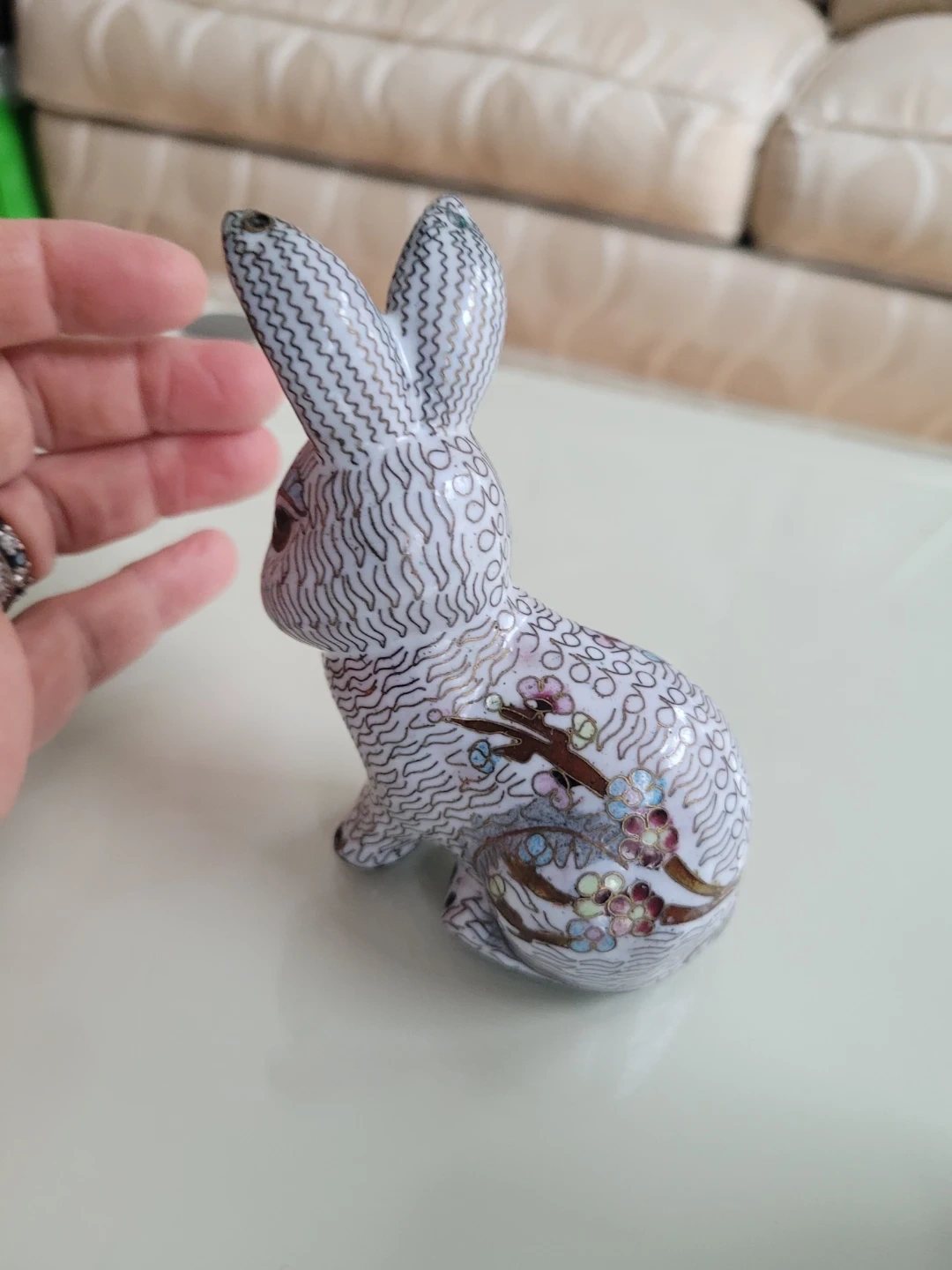 Vintage pair of decorative cloisonné figurines featuring a rabbit and a dog. Each piece displays intricate patterns and floral details. These items add a charming touch to any decor. Easter is coming, cute as a keepsake for grandchildren.