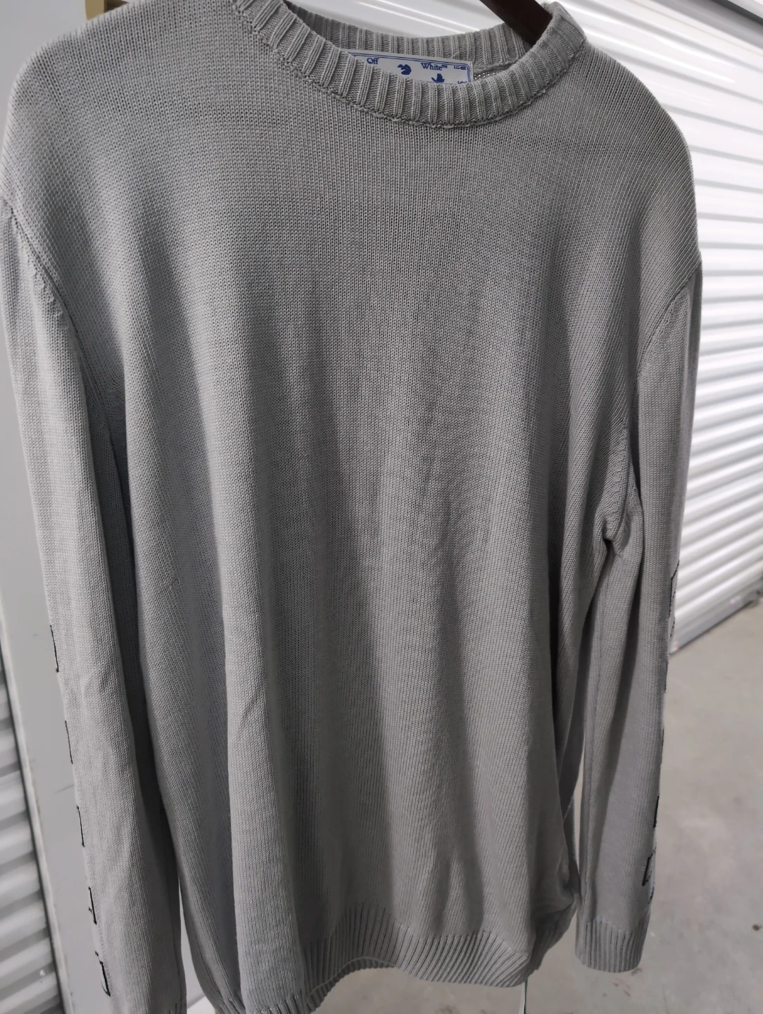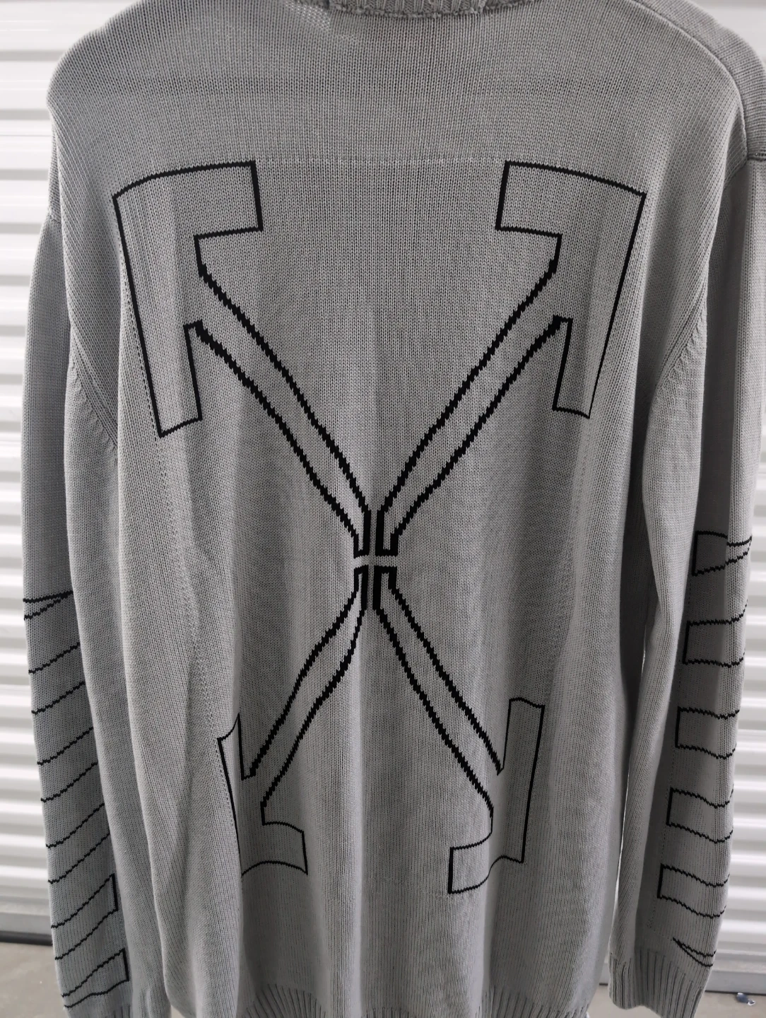 Selling a gently used Off-White knit sweater in a stylish grey colour. Features the iconic Off-White logo on the back. Perfect for adding a touch of streetwear to your wardrobe!