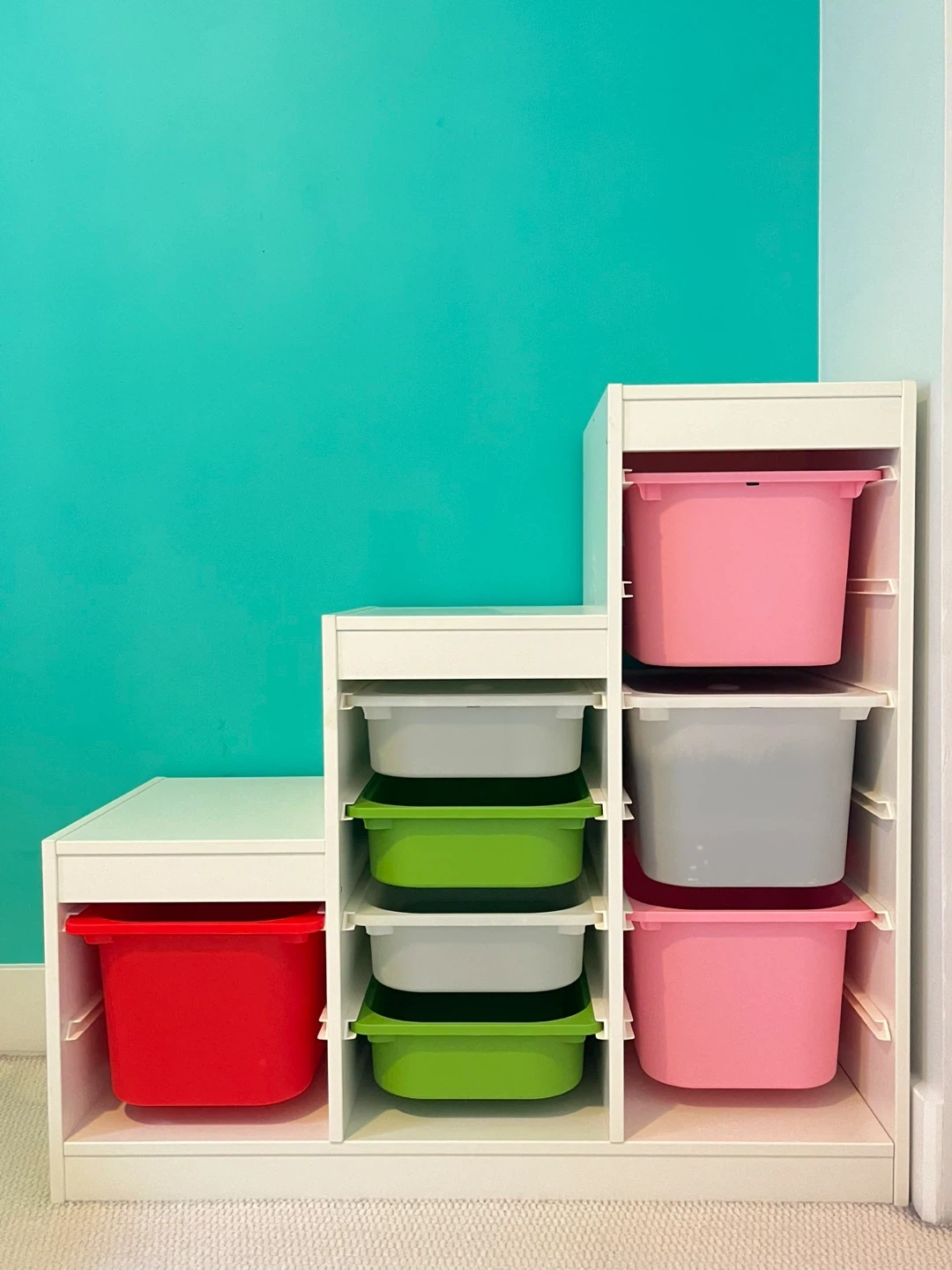 A sturdy storage shelf (white) with bins from IKEA - perfect for organizing items like toys, books, etc.