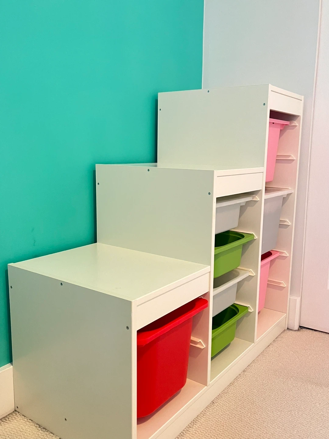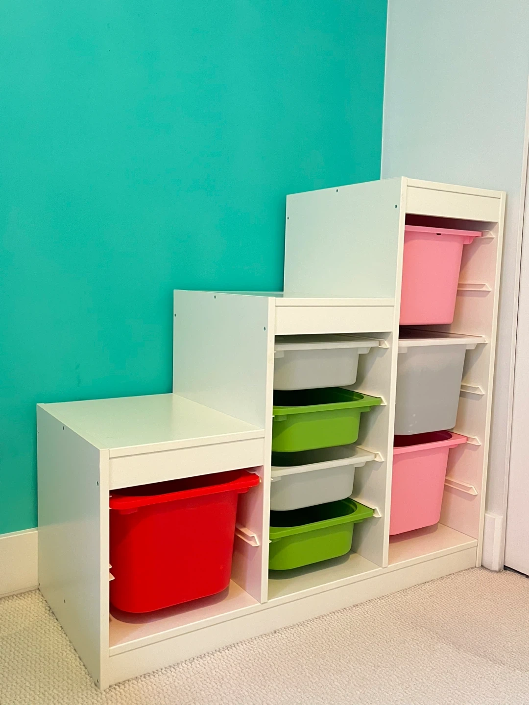 A sturdy storage shelf (white) with bins from IKEA - perfect for organizing items like toys, books, etc.