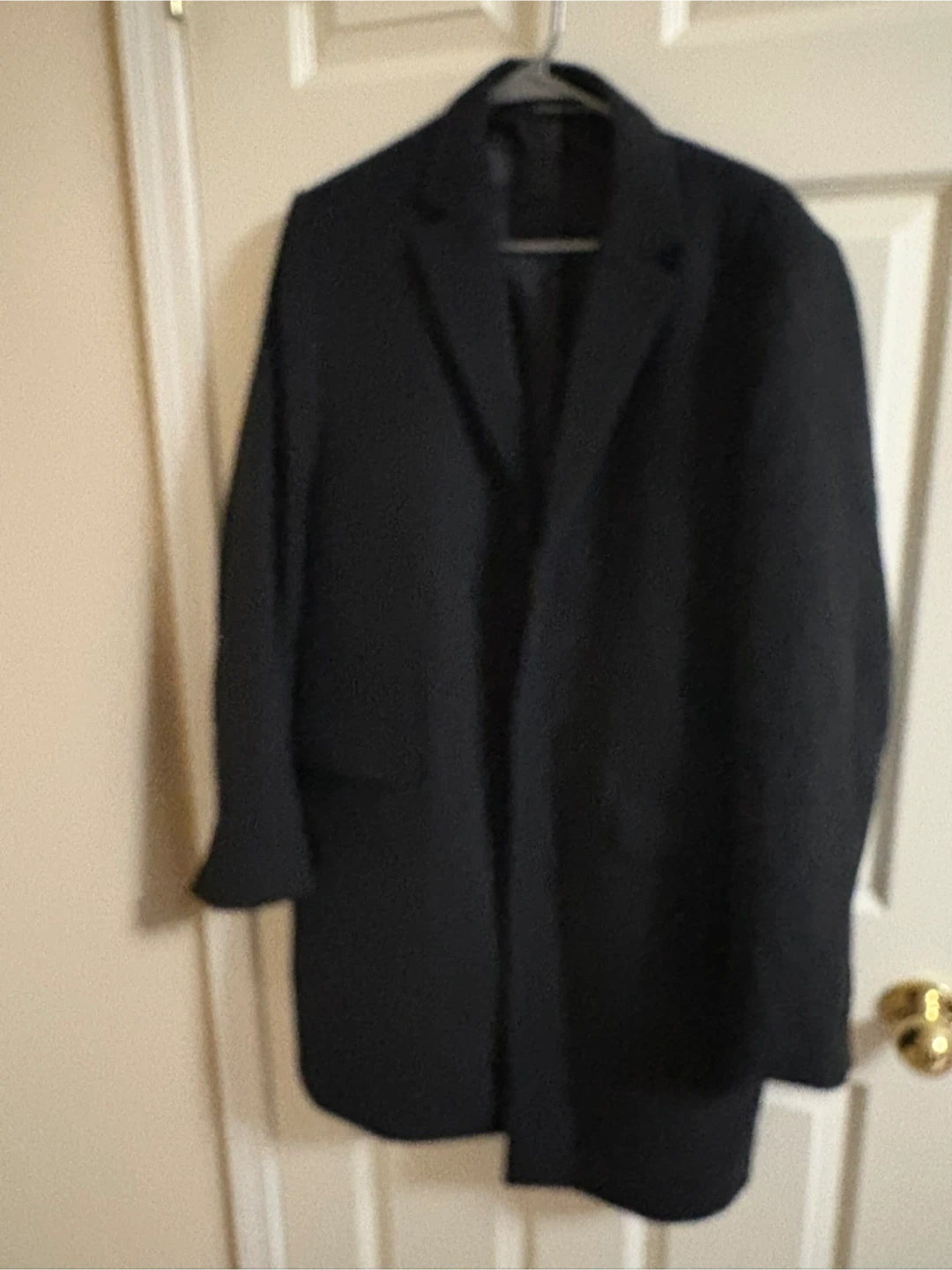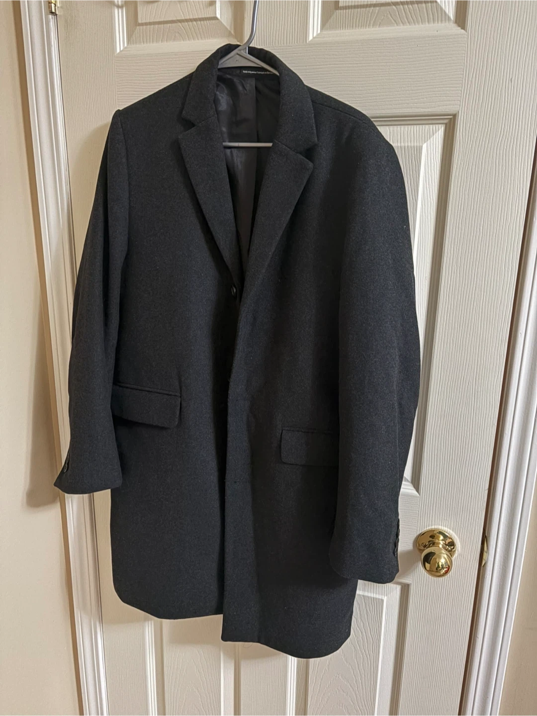 H&M Classic single-breasted overcoat in a charcoal grey wool blend. It features a notched lapel and two front flap pockets. This coat is great for layering over suits or casual wear during cooler weather.