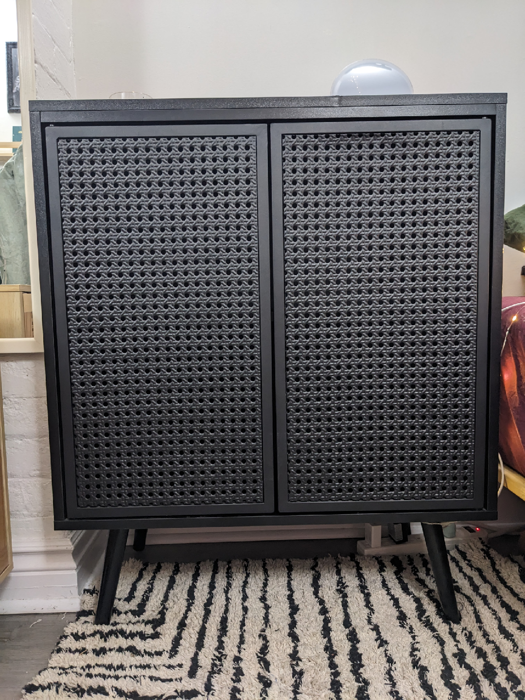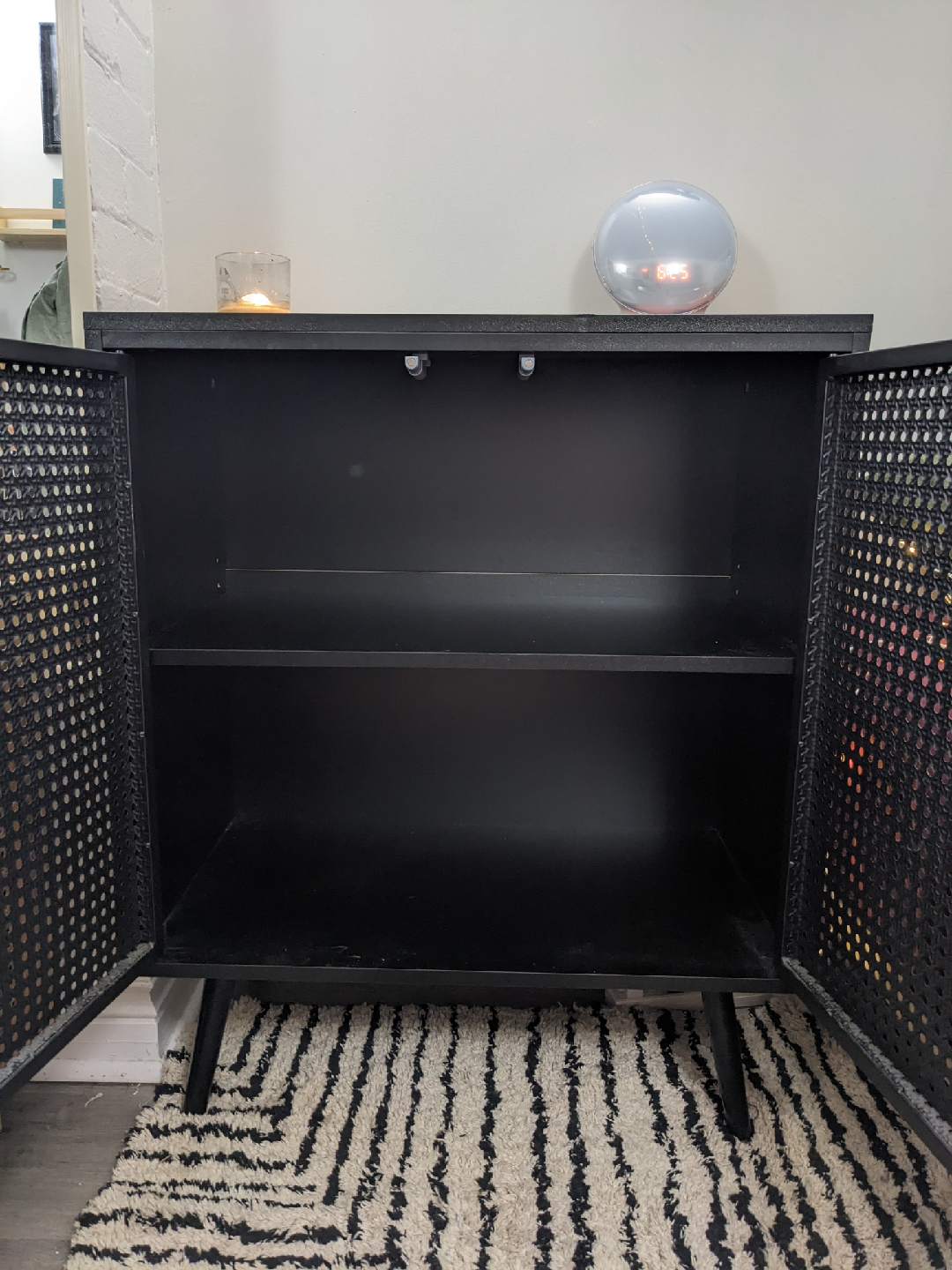 A sleek black accent cabinet with metal rattan-look magnetic/push-latch doors and attractive mcm style legs. Its shelf is slightly height-adjustable. It looks good pretty much anywhere, I just no longer have a space for it after moving.
