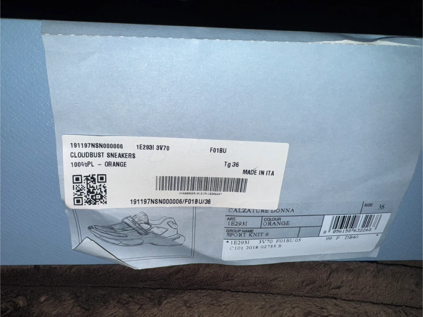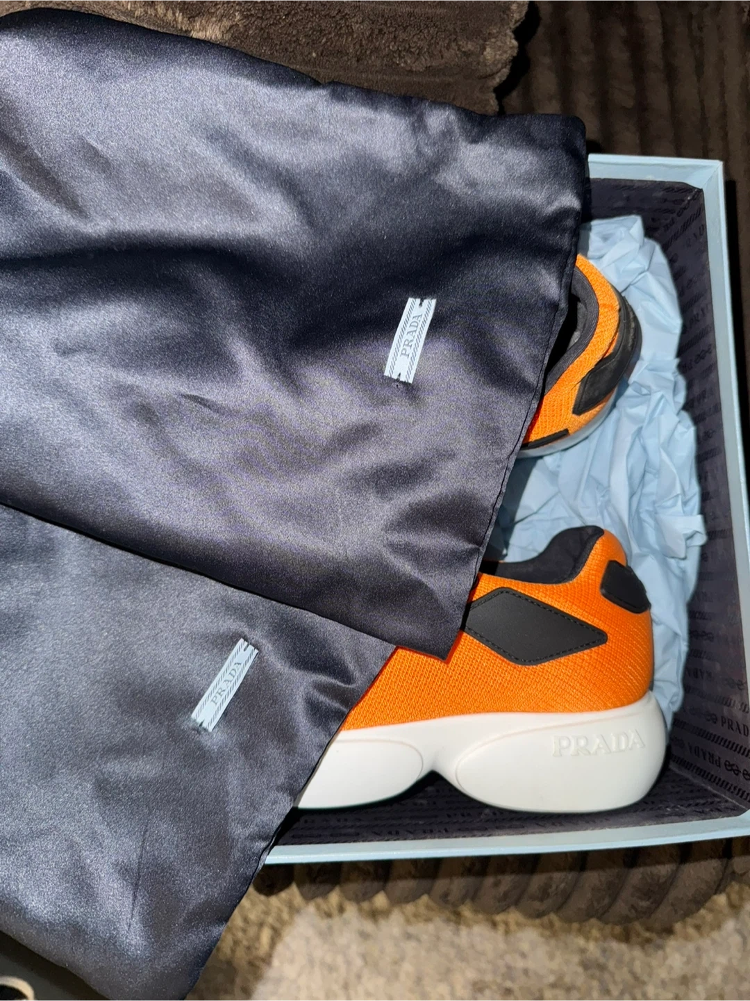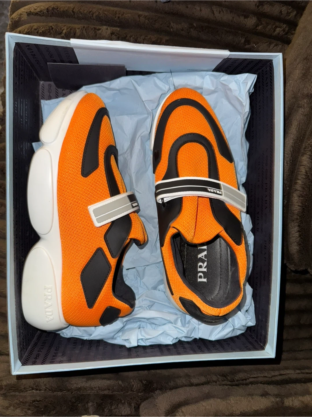 Prada Cloudbust sneakers in orange. These sport knit sneakers come with dust bags and the original box. Made in Italy. Size 36.