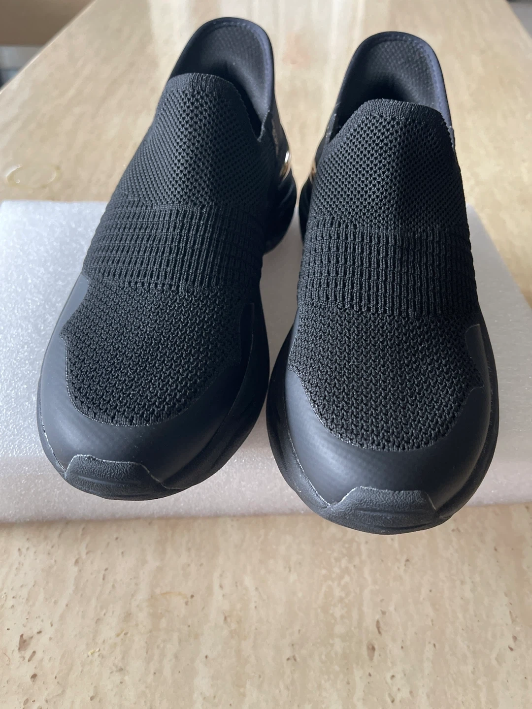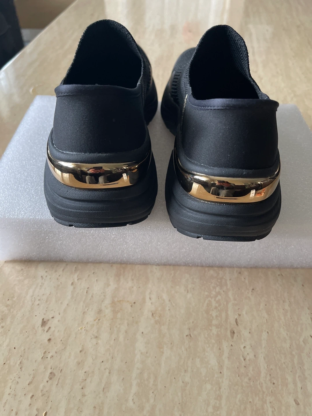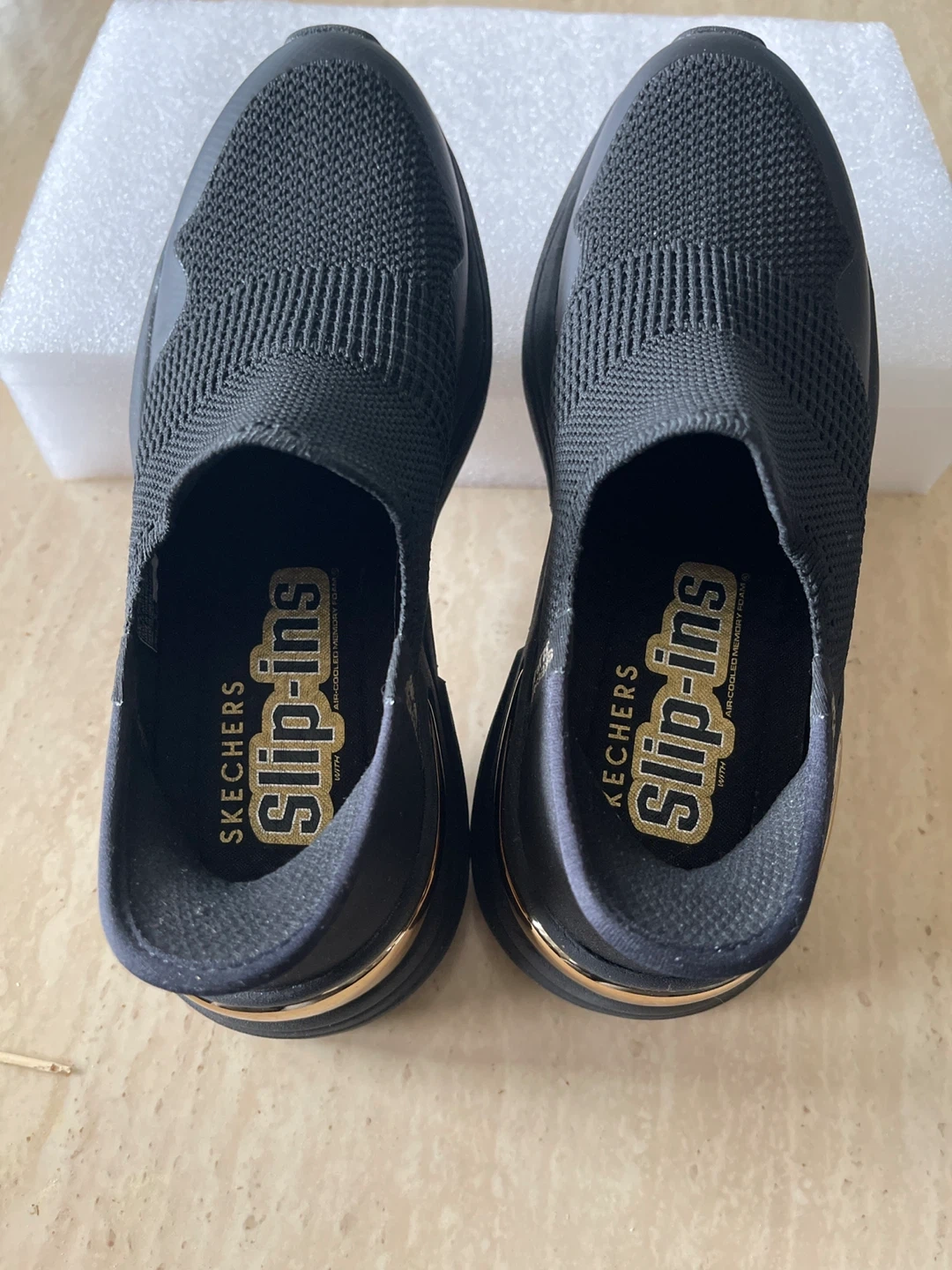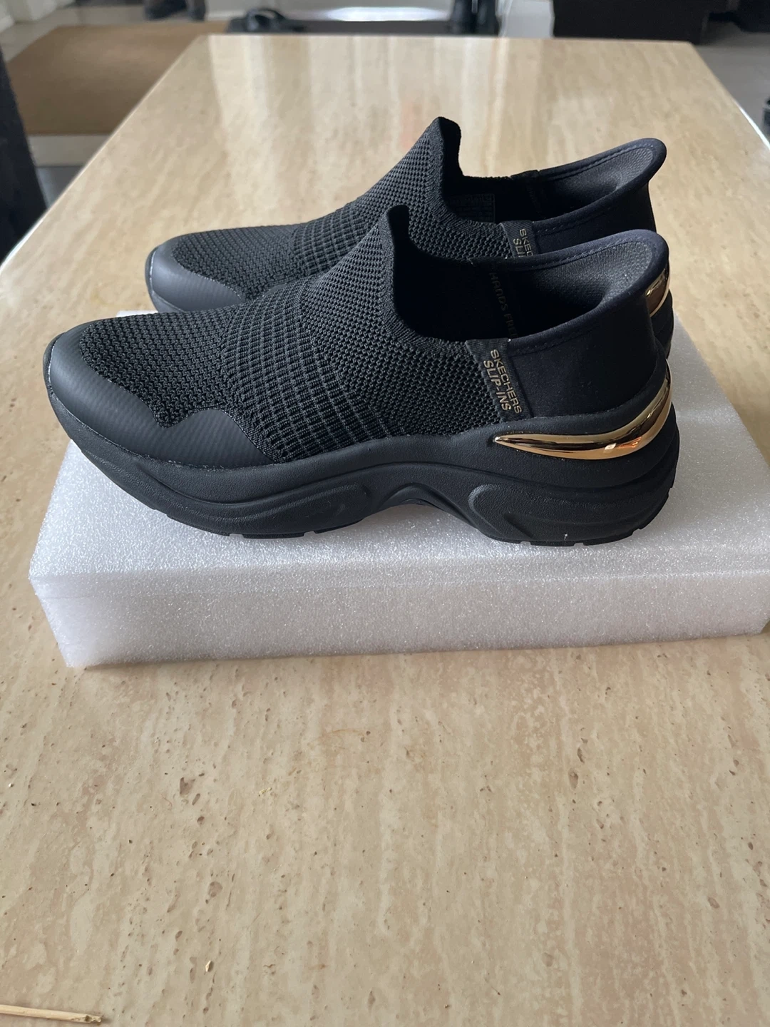 These are Skechers women's black knit slip-on sneakers. They feature a cushioned insole and a flexible knit upper for comfort. The stylish gold accent on the heel adds a nice touch.