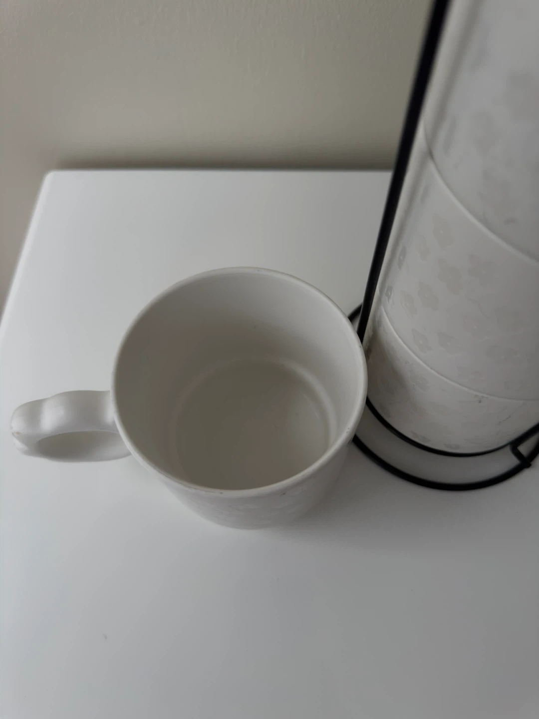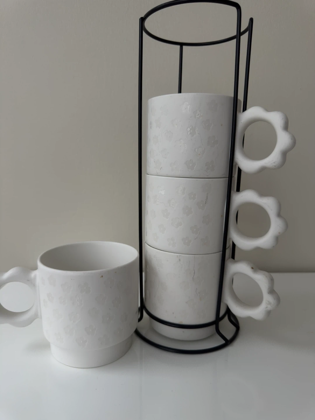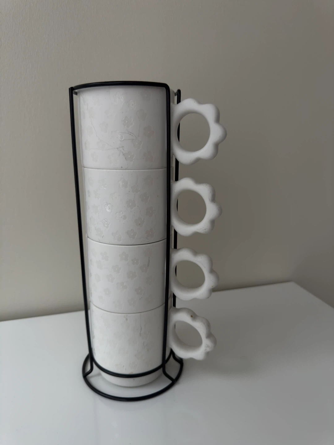 This is a set of four white ceramic mugs with a subtle floral pattern. They come with a black metal rack for storage. Only 1 cup is used and other 3 are new.