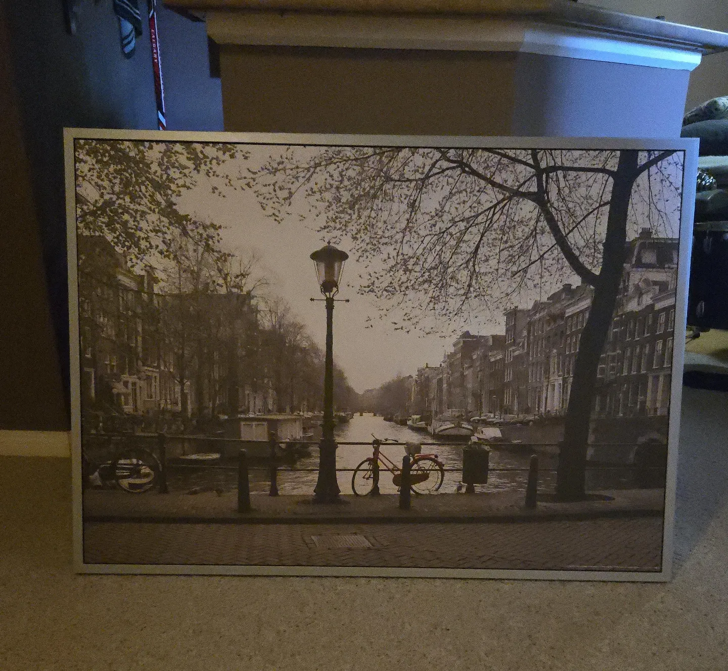 This framed wall art depicts a scenic view of an Amsterdam canal with bicycles and historic buildings. It's a great piece to add a touch of European charm to any room. The artwork features a sepia-toned print in a silver-coloured frame.