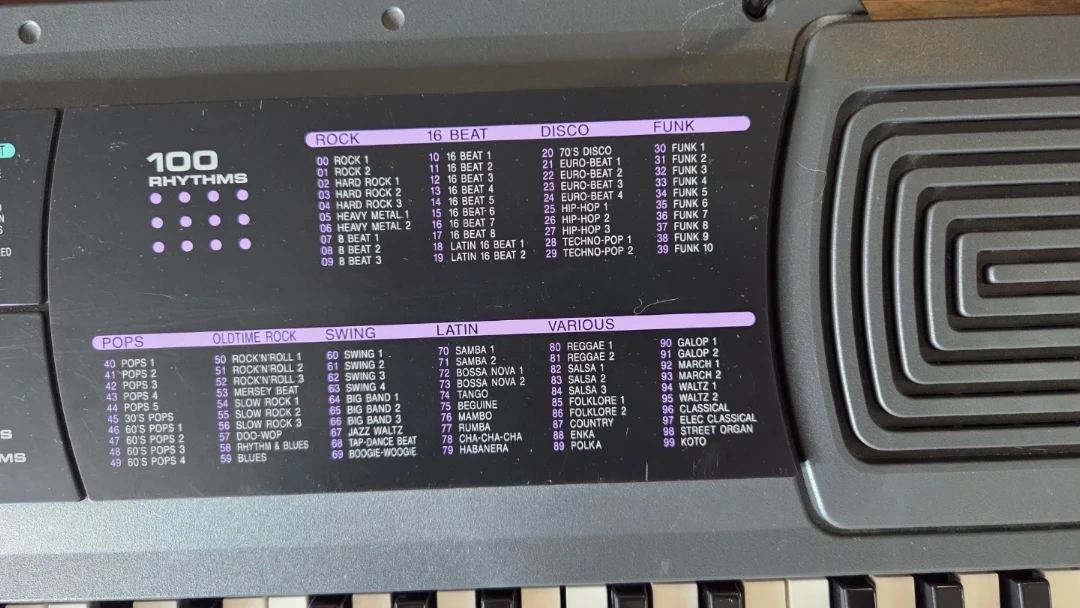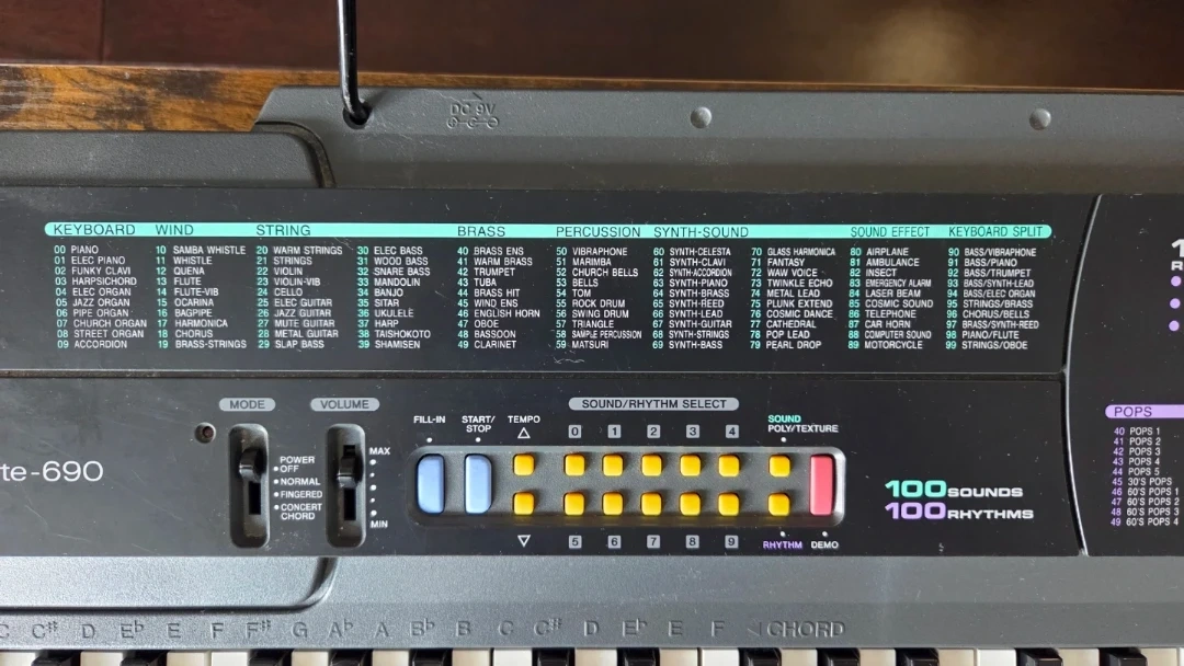 This Radioshack Concertmate 690 keyboard offers 100 rhythms and 100 sounds. It features different keyboard, wind, string, brass, and percussion instruments. This keyboard is great for learning or casual playing!