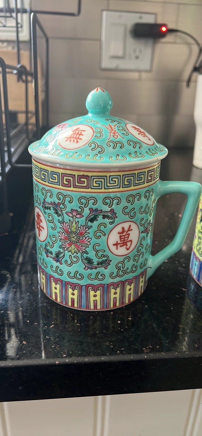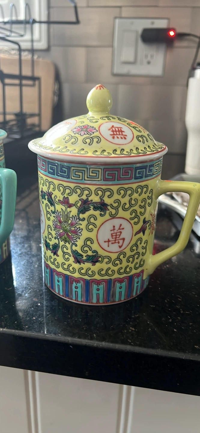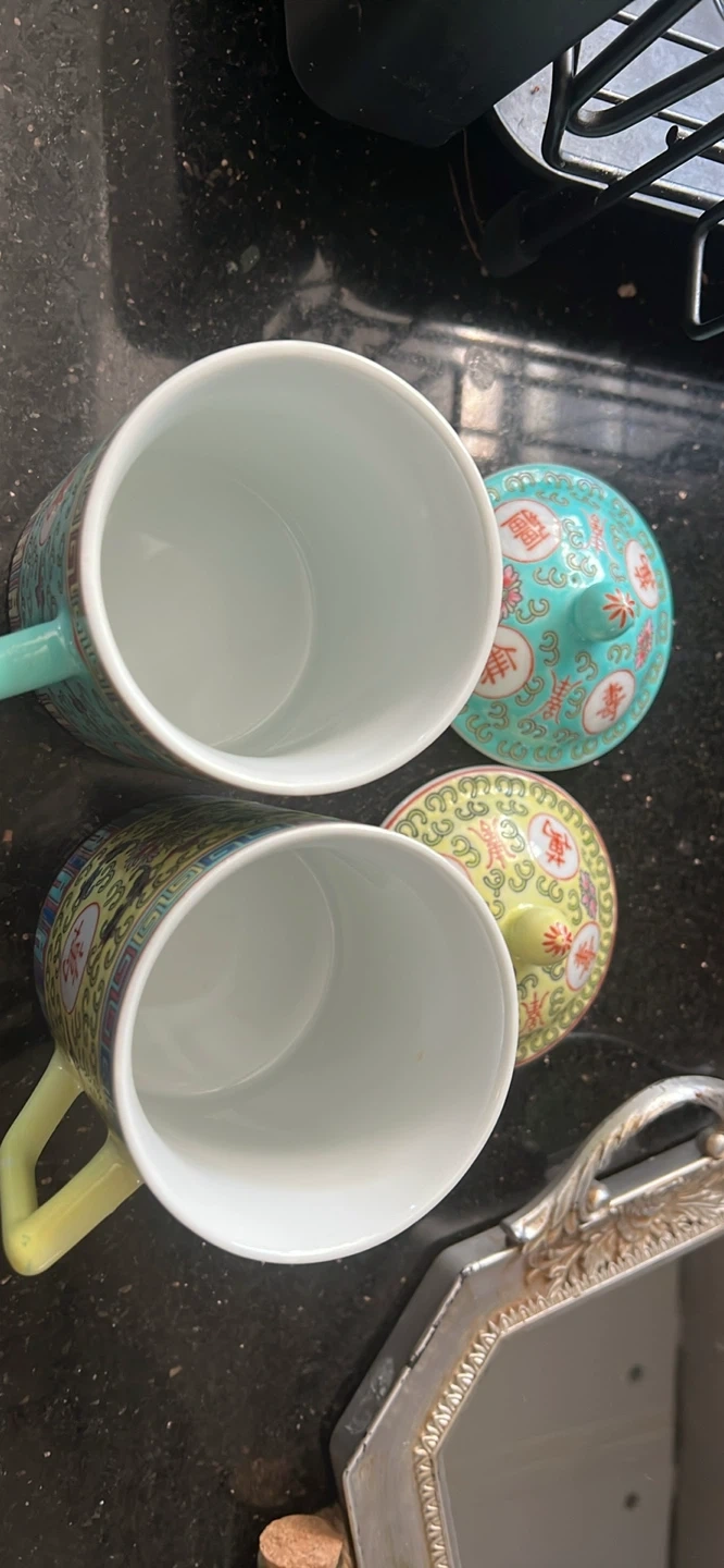You'll get two beautifully decorated porcelain mugs with lids. One mug is a lovely teal, and the other is a sunny yellow, both featuring intricate traditional Chinese patterns and characters. They're perfect for enjoying your favorite hot beverages!
