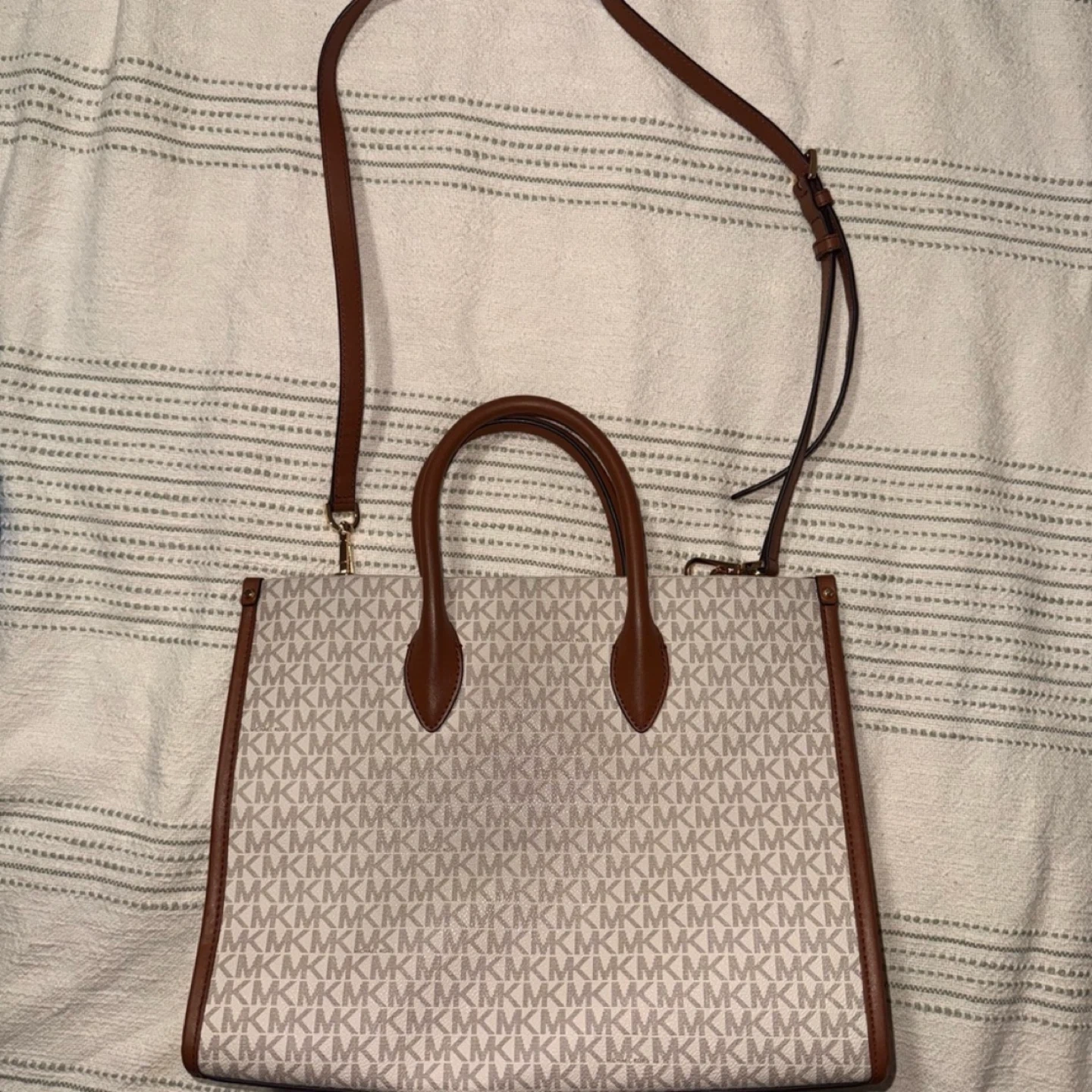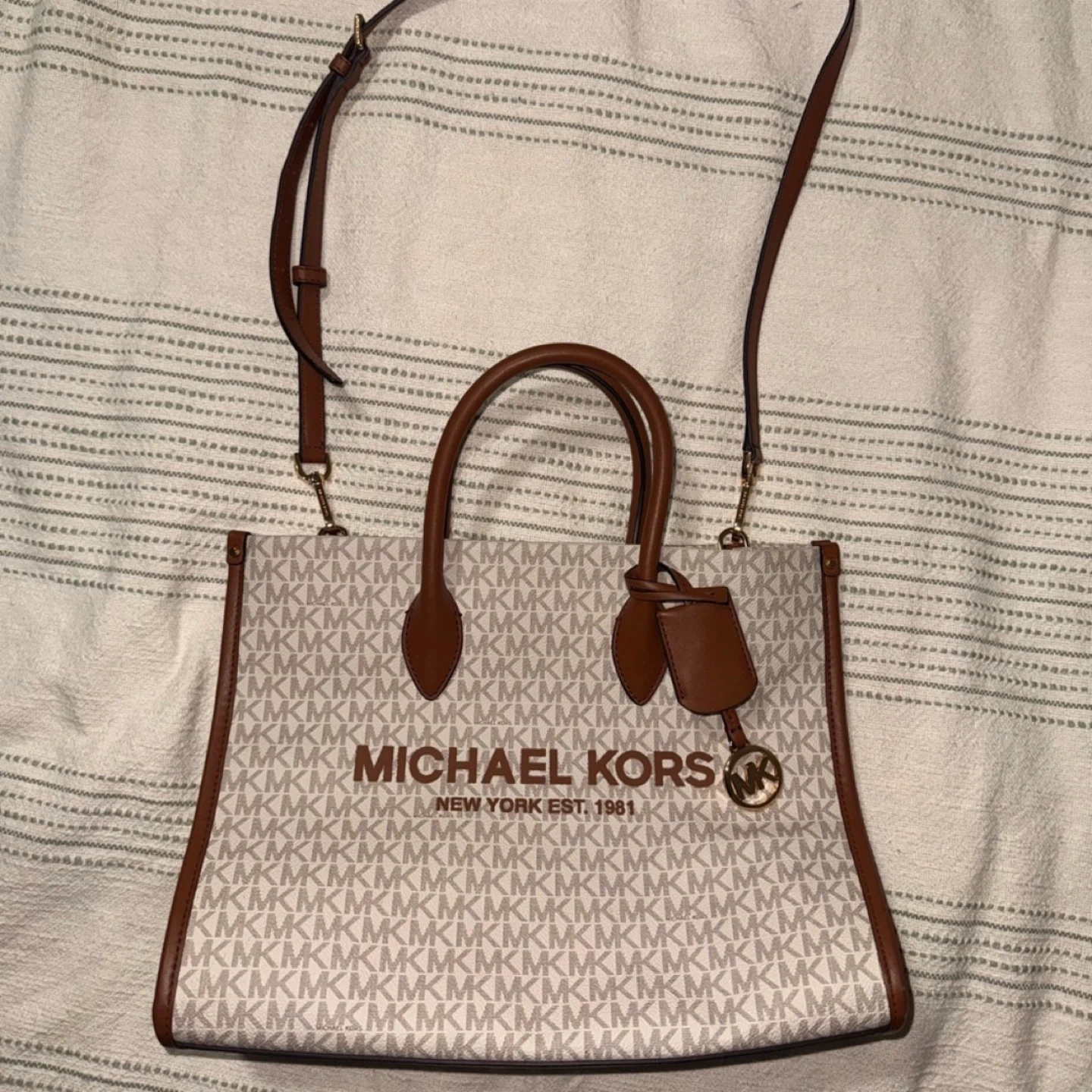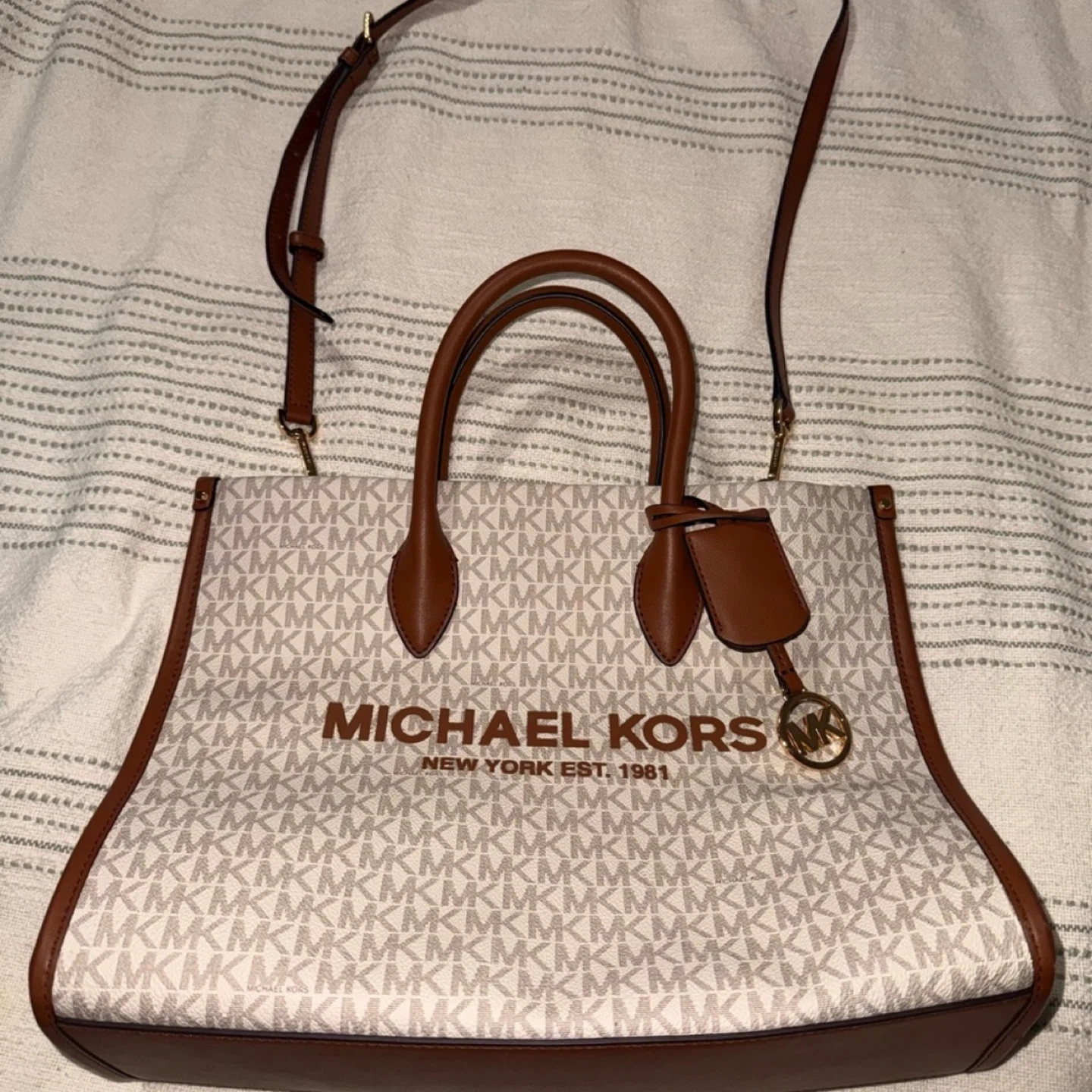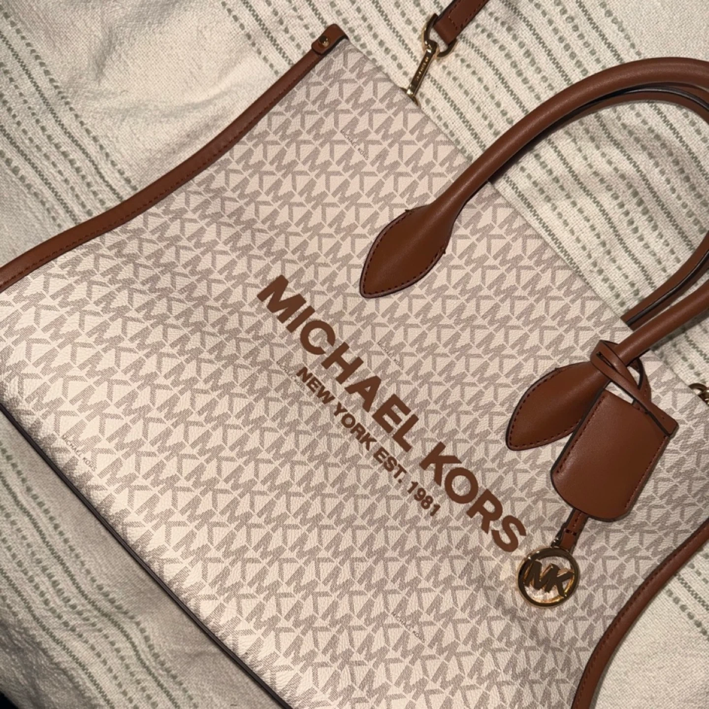 This is a stylish Michael Kors tote bag. It features the classic MK logo pattern and brown leather accents. Perfect for everyday use!