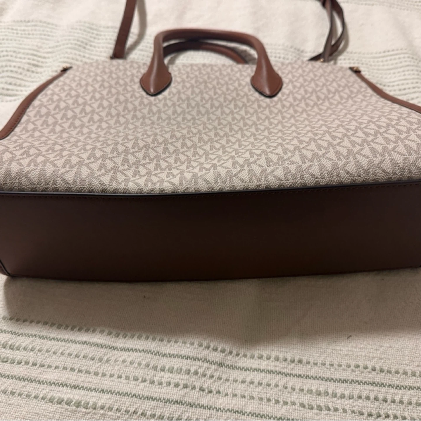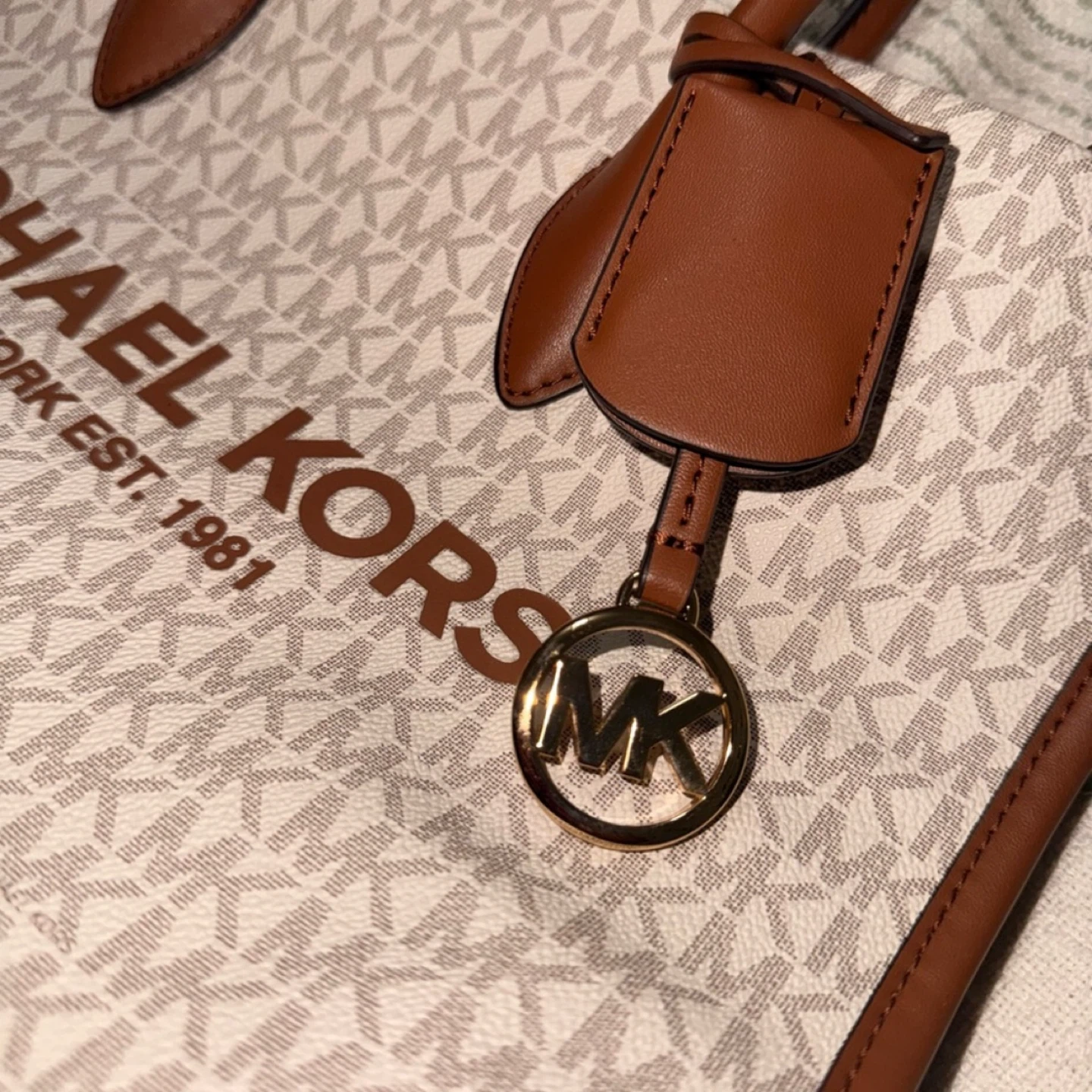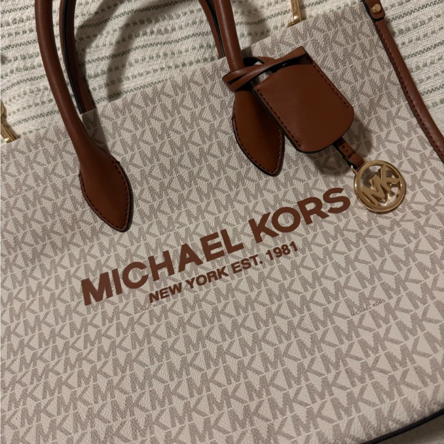 This is a stylish Michael Kors tote bag. It features the classic MK logo pattern and brown leather accents. Perfect for everyday use!