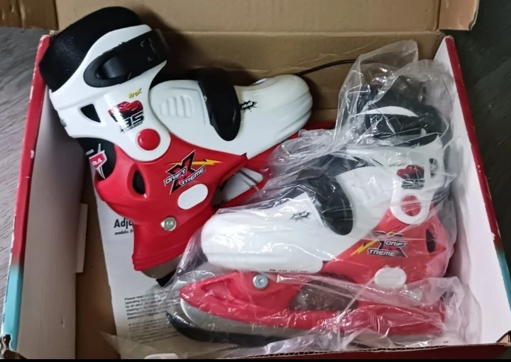These red and white Drift Xtreme skates are adjustable. They come with a second set of wheels for drifting. Excellent for learning to skate!