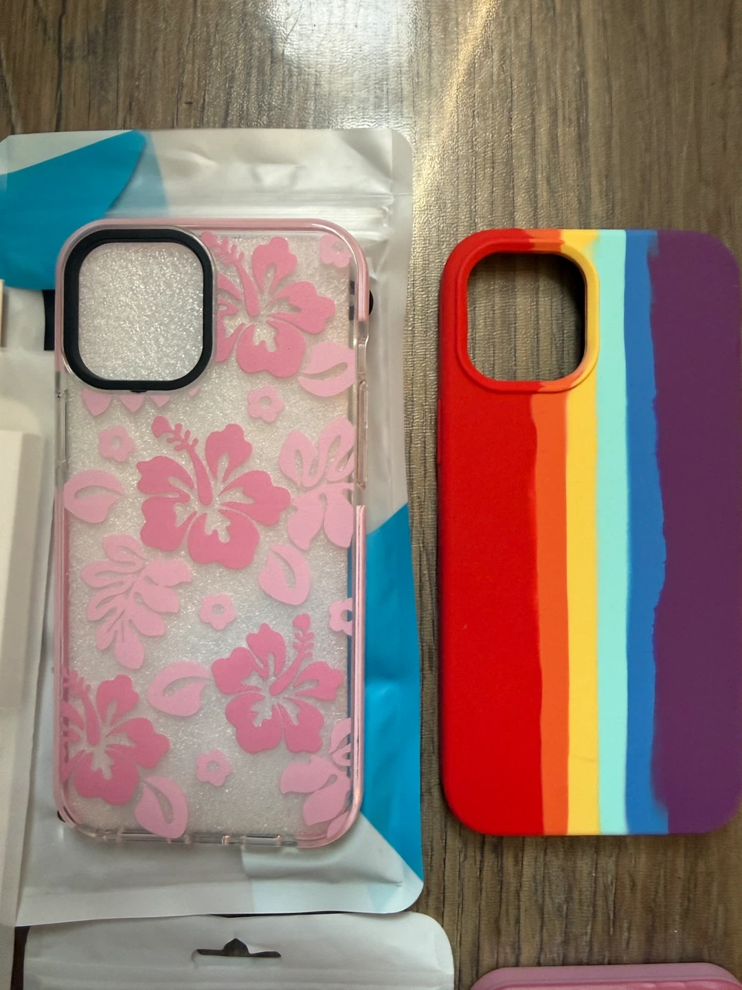 Selling a bundle of five phone cases for an iPhone 12 Pro Max. Includes a clear floral case, a rainbow striped silicone case, a black textured case, a pink protective case with camera cover, and a pink solid case. Screen protector kit also included with guide stickers and wipes.