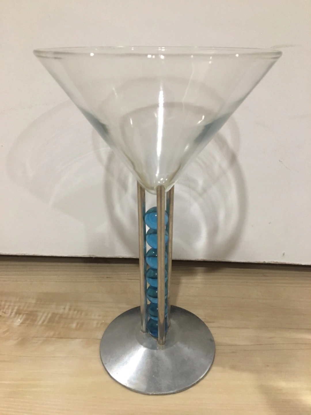 This martini glass has a clear glass bowl and a metal stem filled with blue glass beads.