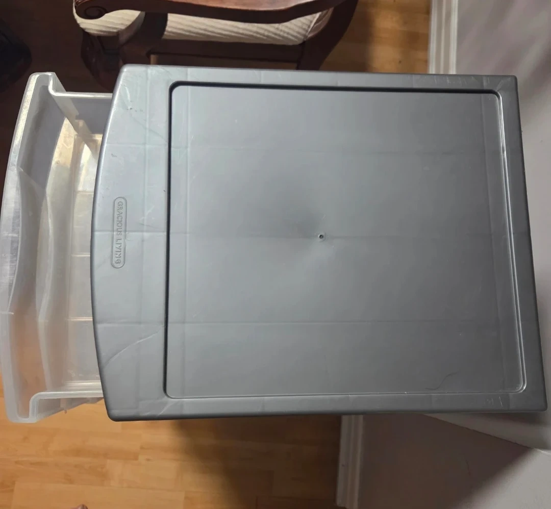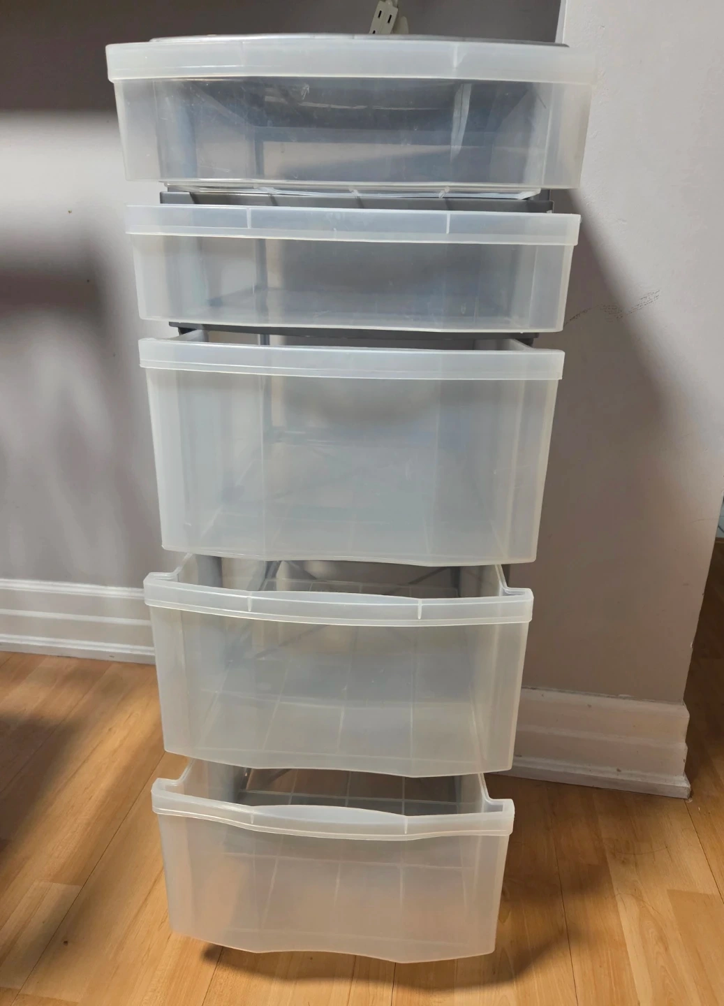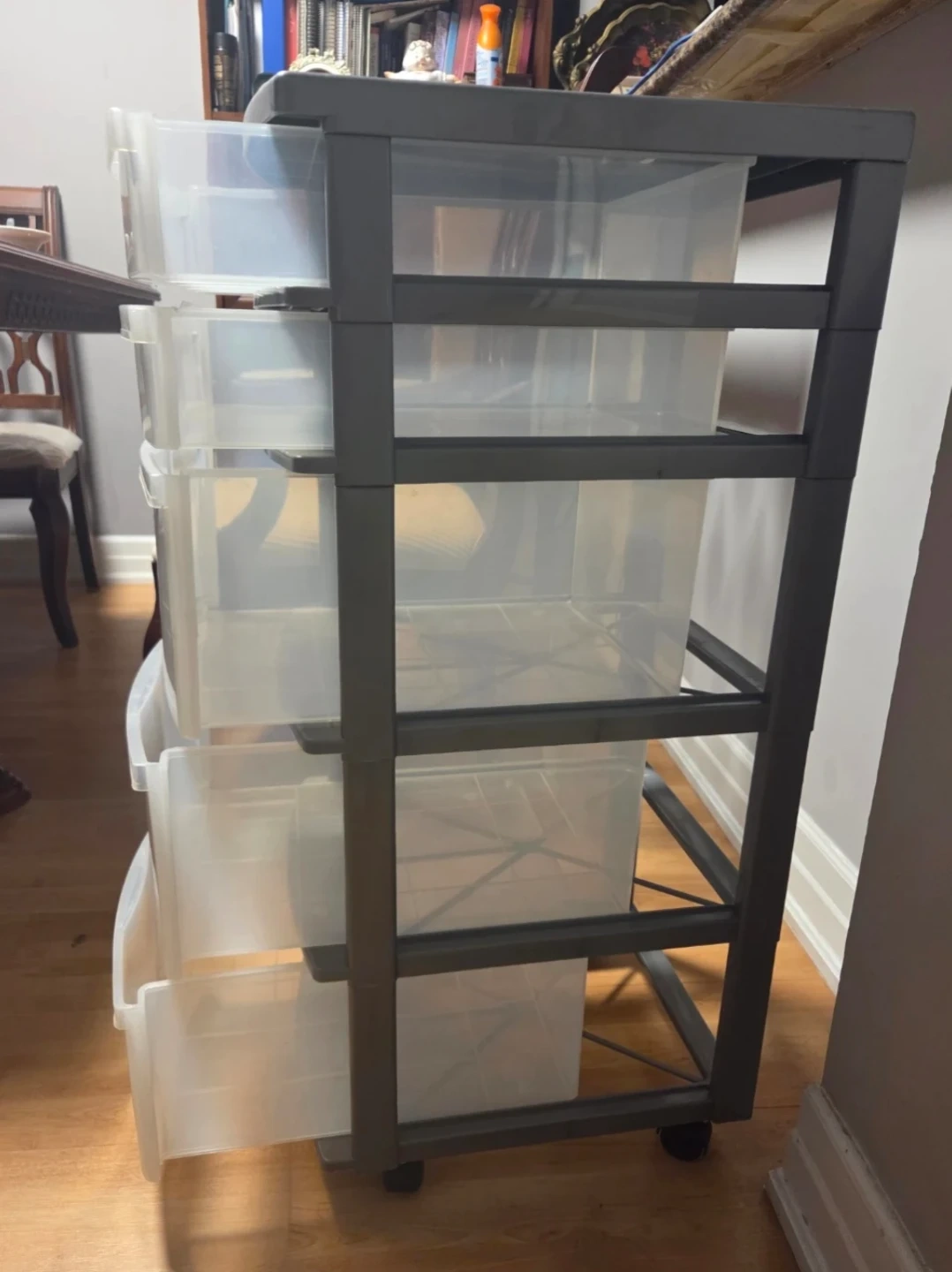 This rolling storage cart has 5 clear plastic drawers and a grey frame. It's on wheels for easy movement. Great for organizing craft supplies or office essentials!