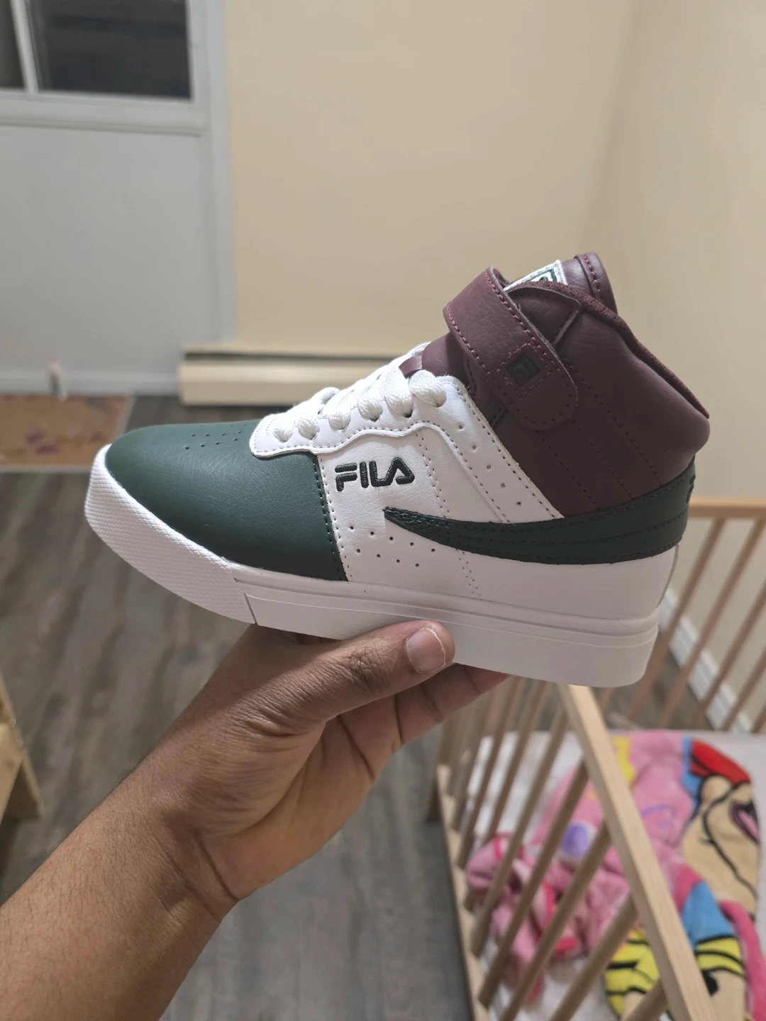 Fila VULC 13 BC mid-top shoes for kids. Colourway is syca/wht/lawn. These shoes have a velcro strap and lace-up closure. The size is a Kids' 13.