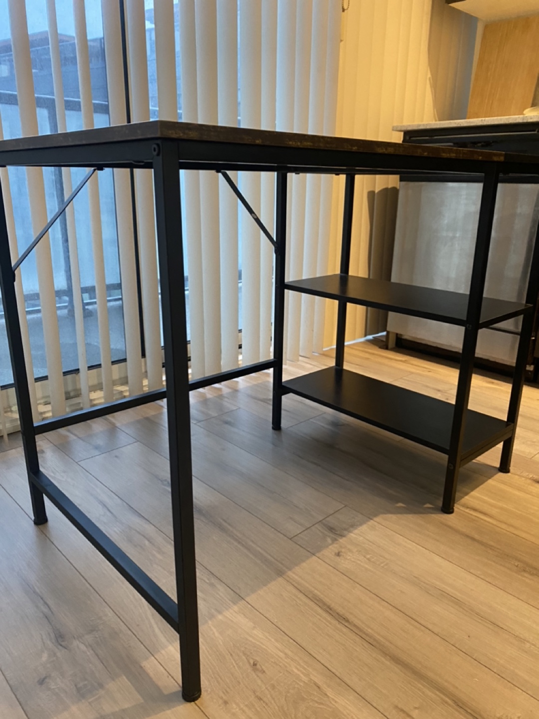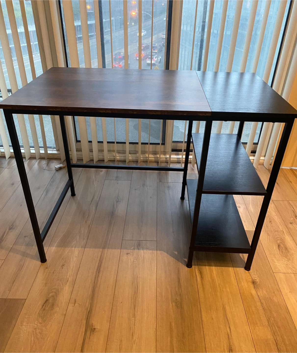 Selling an industrial-style desk featuring built-in shelves. It's a sturdy desk with a rustic wood-look top and a sleek black metal frame. Great for a home office or study space! Clean and neat, very well maintained, good as new. Free of any coffee mug stains or scratches. Size 39.5’L x 29.5’H x 23.5’W