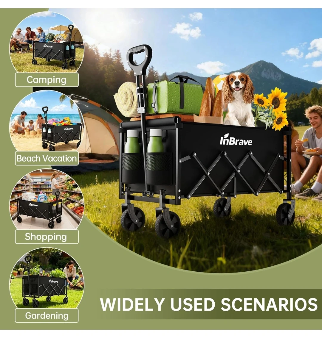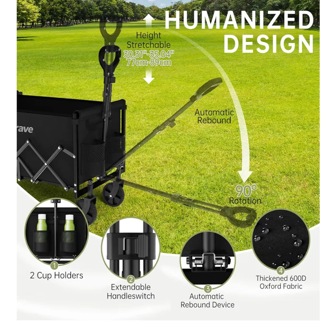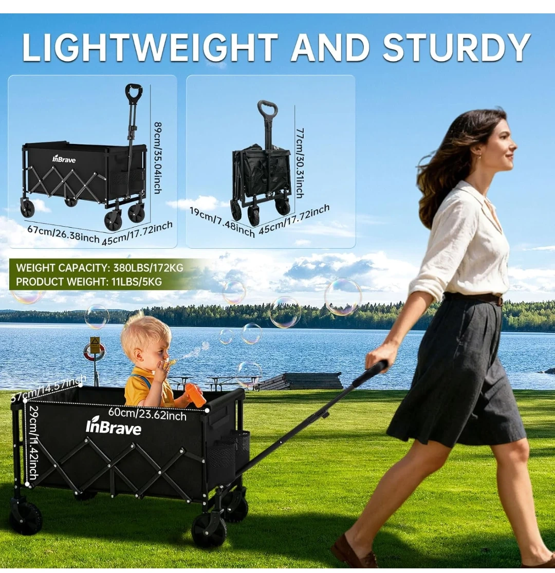 This InBrave wagon cart is made of thickened 600D Oxford fabric and features all-terrain wheels for smooth gliding on various surfaces. It has a weight capacity of 380 lbs and comes with 2 cup holders. The height is adjustable from 30.31" to 35.04".
