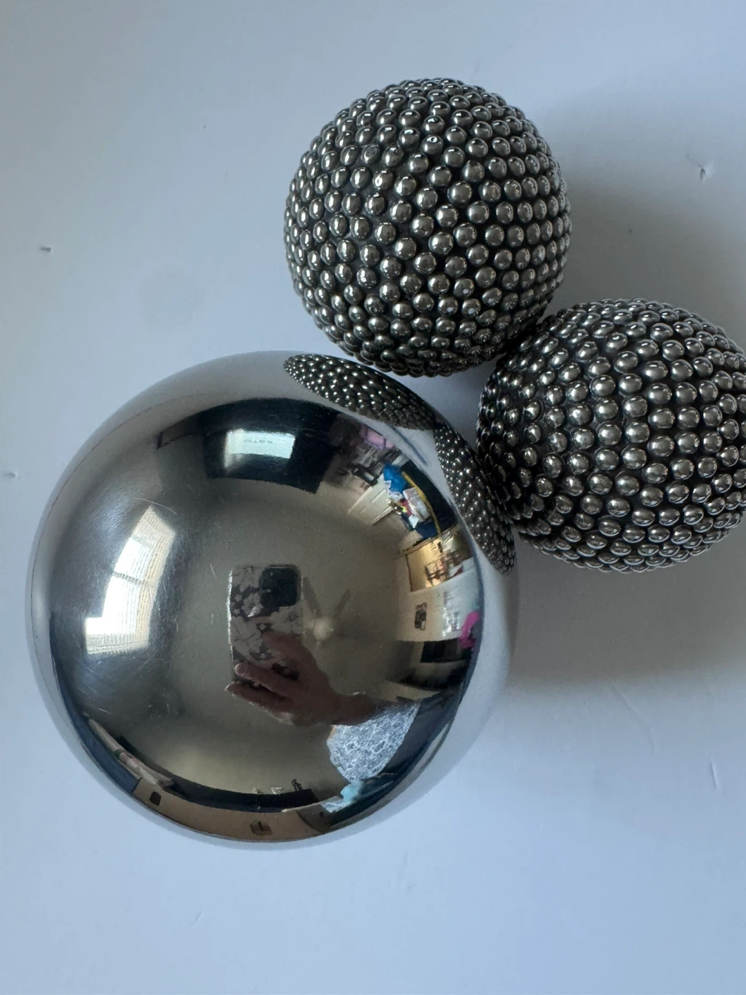 This set includes one large, smooth silver sphere and two smaller spheres covered in silver beads. They're made of metal and would add a modern touch to any decor. CARB P1 compliant sticker is visible on the underside of the large sphere.