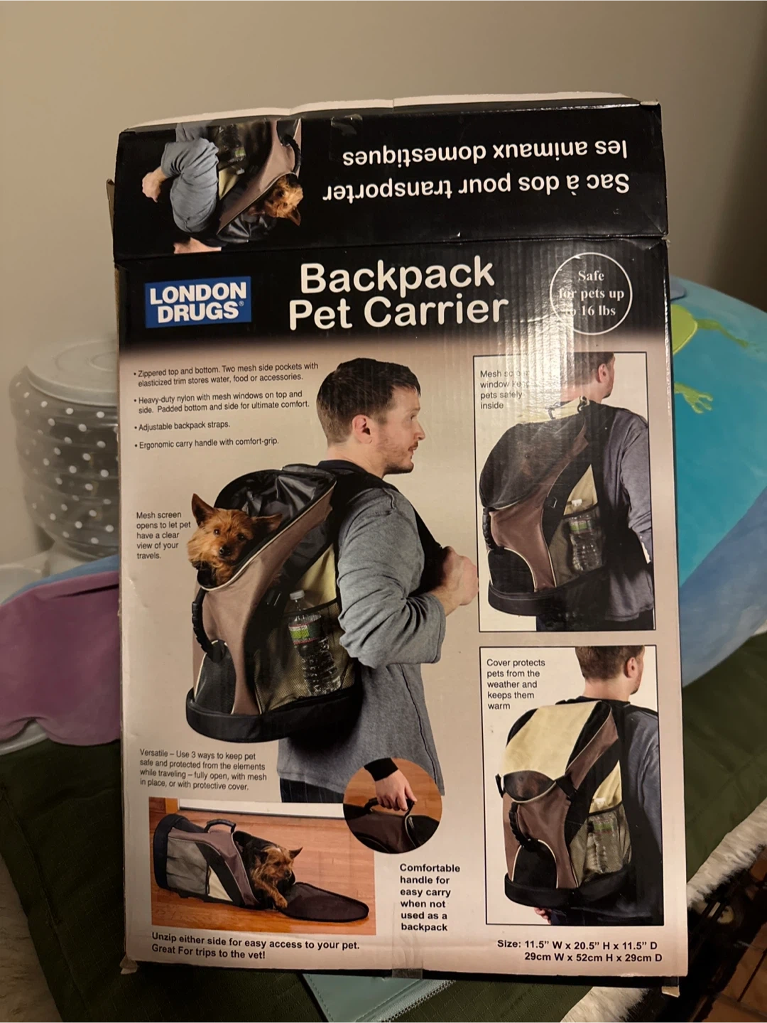 This London Drugs backpack pet carrier is made of heavy-duty nylon with mesh windows for ventilation. It features zippered top and bottom access, side pockets, and adjustable straps. The carrier is safe for pets up to 16 lbs. Dimensions are 11.5" W x 20.5" H x 11.5" D.