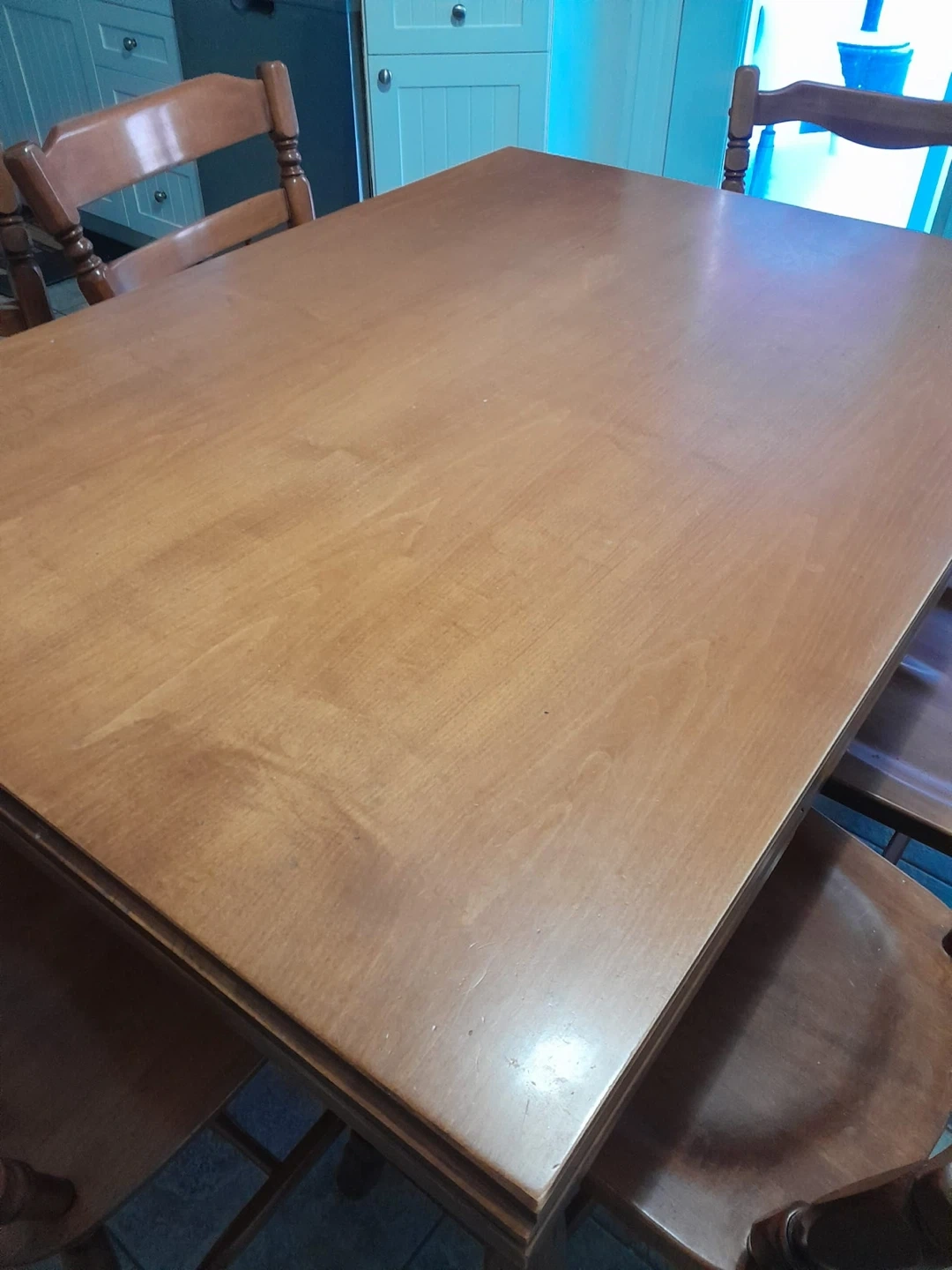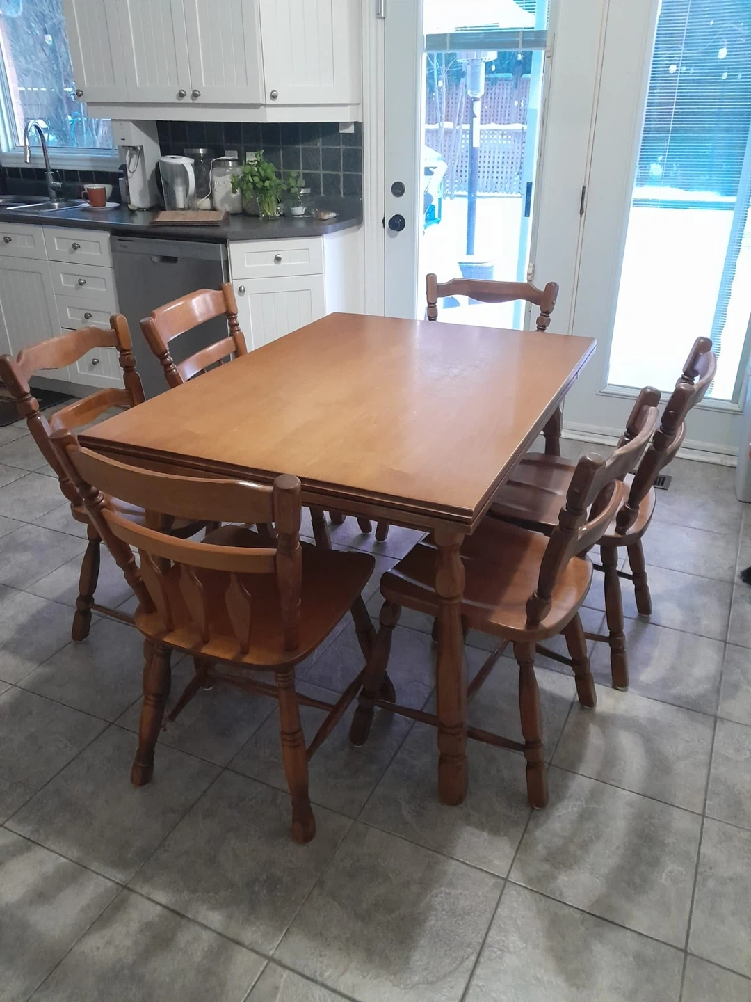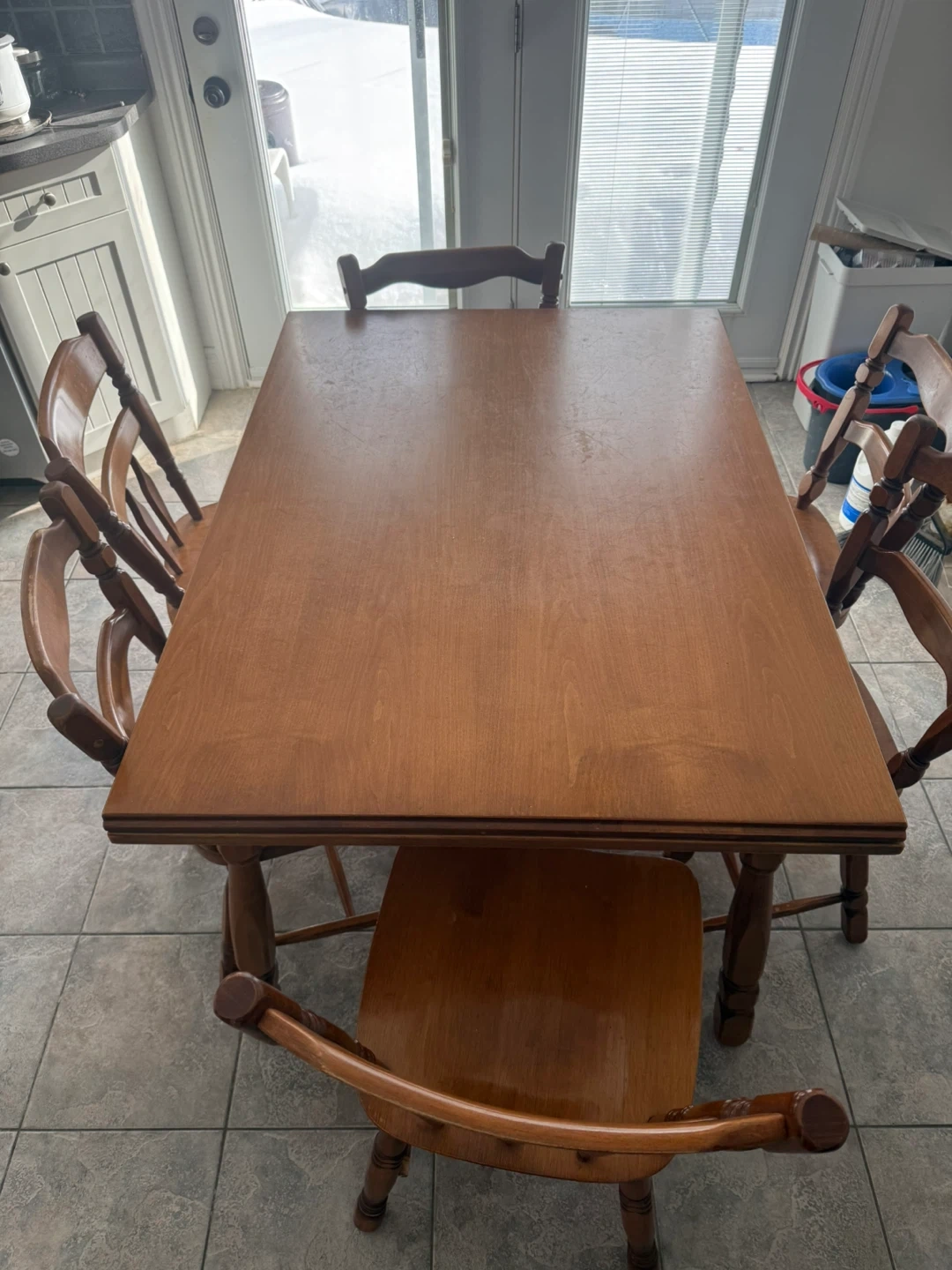 A lovely wooden dining table set with six matching chairs. This set is perfect for family dinners or entertaining guests. The chairs have a classic spindle-back design. It's made of solid wood. Extendible