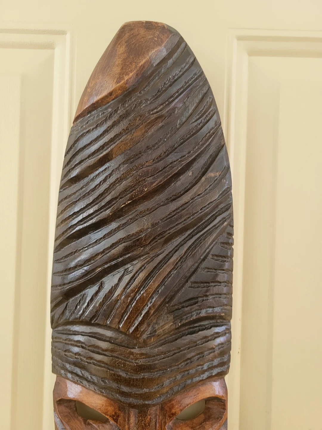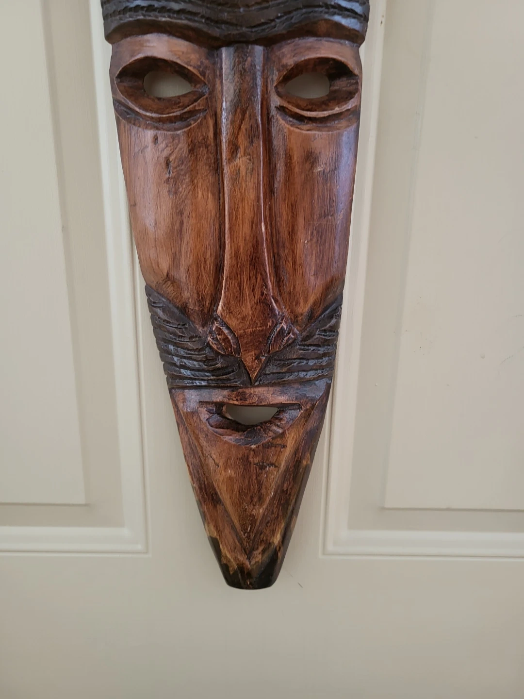 This is a unique, hand-carved wooden mask. It's made from solid wood with a rich, dark finish. The detailed carving makes it a striking piece for home decor.