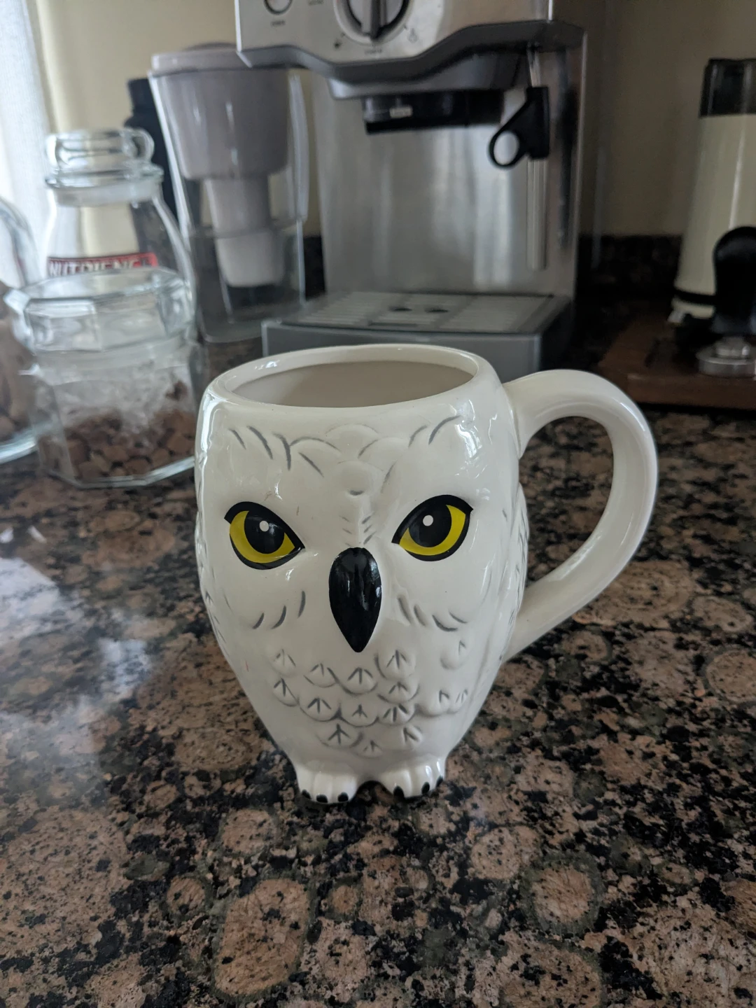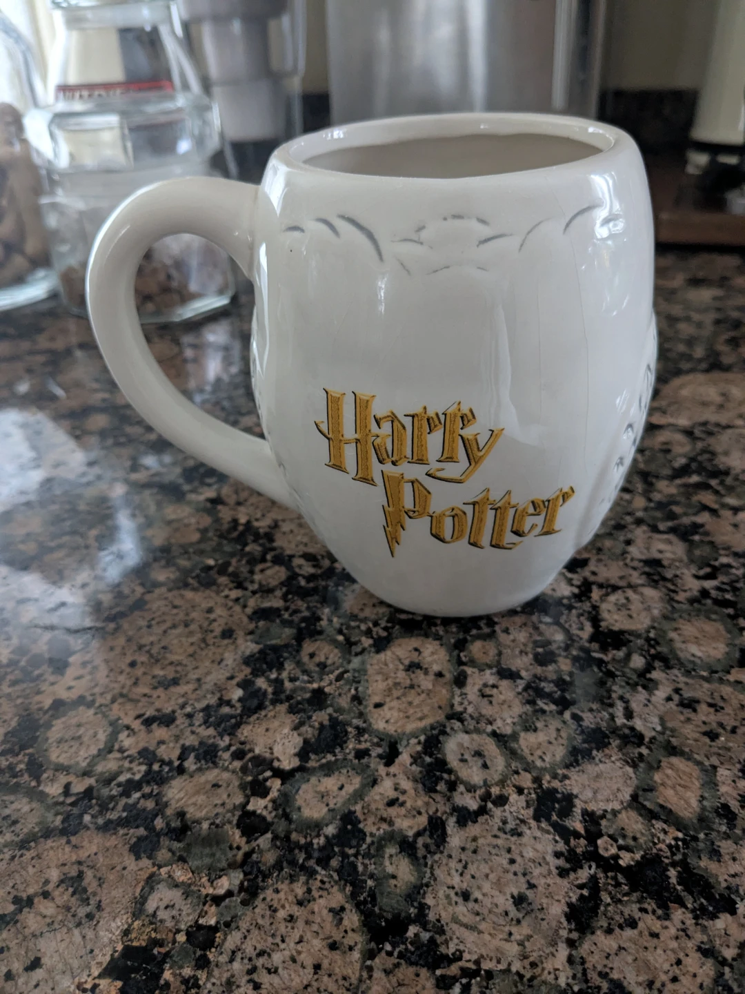 White ceramic mug featuring Harry Potter's owl, Hedwig. It has the "Harry Potter" logo on one side and Hedwig's face on the front. Dishwasher and microwave safe. 24 oz capacity.