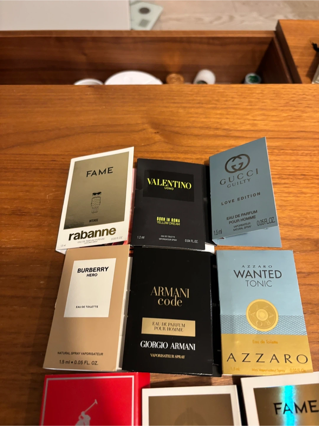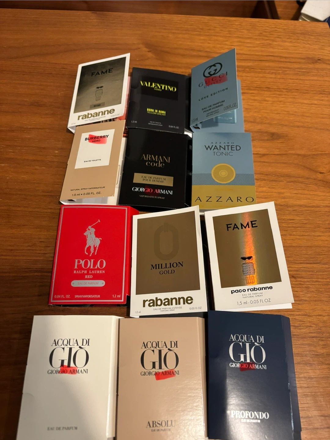 A collection of various men's cologne sample vials. Includes scents from brands like Gucci, Paco Rabanne, Valentino, and Giorgio Armani. Great for trying out new fragrances!