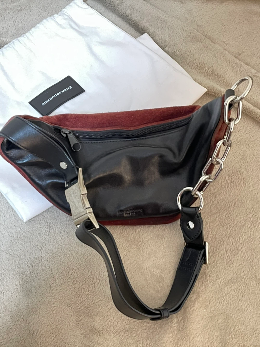 Alexander Wang belt bag burgundy suede and black leather. It has multiple zippered compartments for storage. Includes original dust bag.