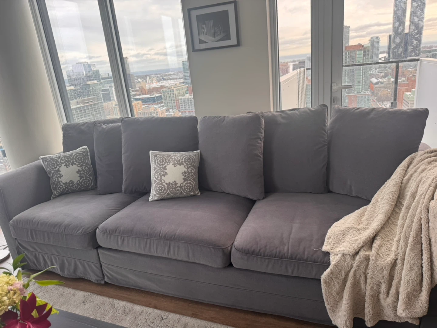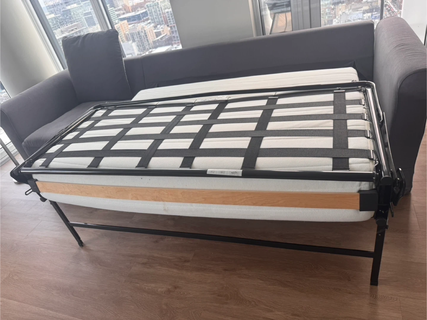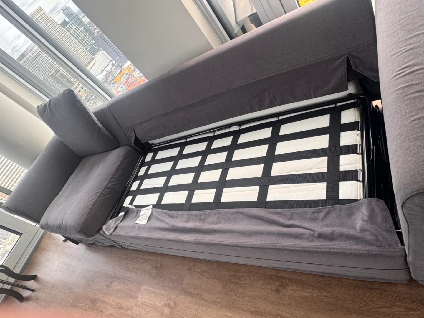 This is a grey sofa that converts into a bed. It has a sturdy metal frame and a comfortable mattress. It's perfect for when you have overnight guests!