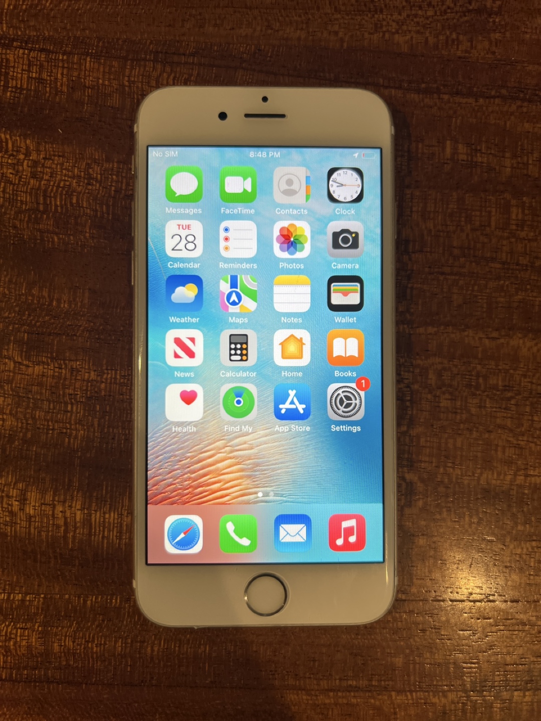 A smart phone with a white finish. Showing the home screen with many apps. A great way to connect with loved ones or to relax with your favourite games.