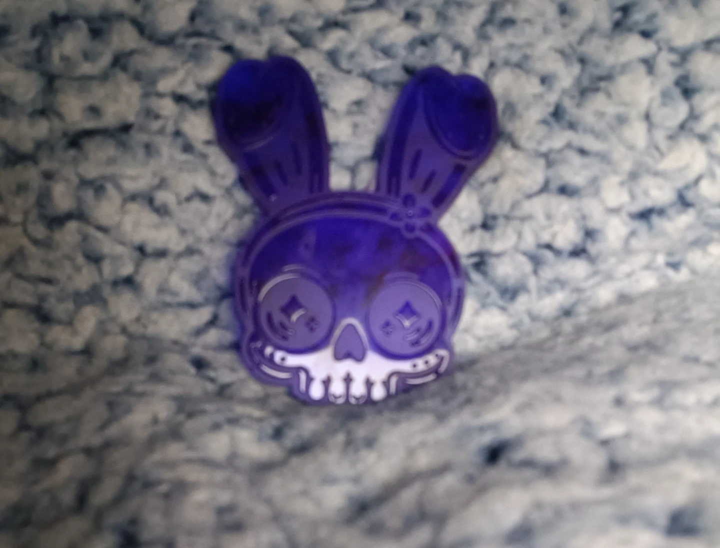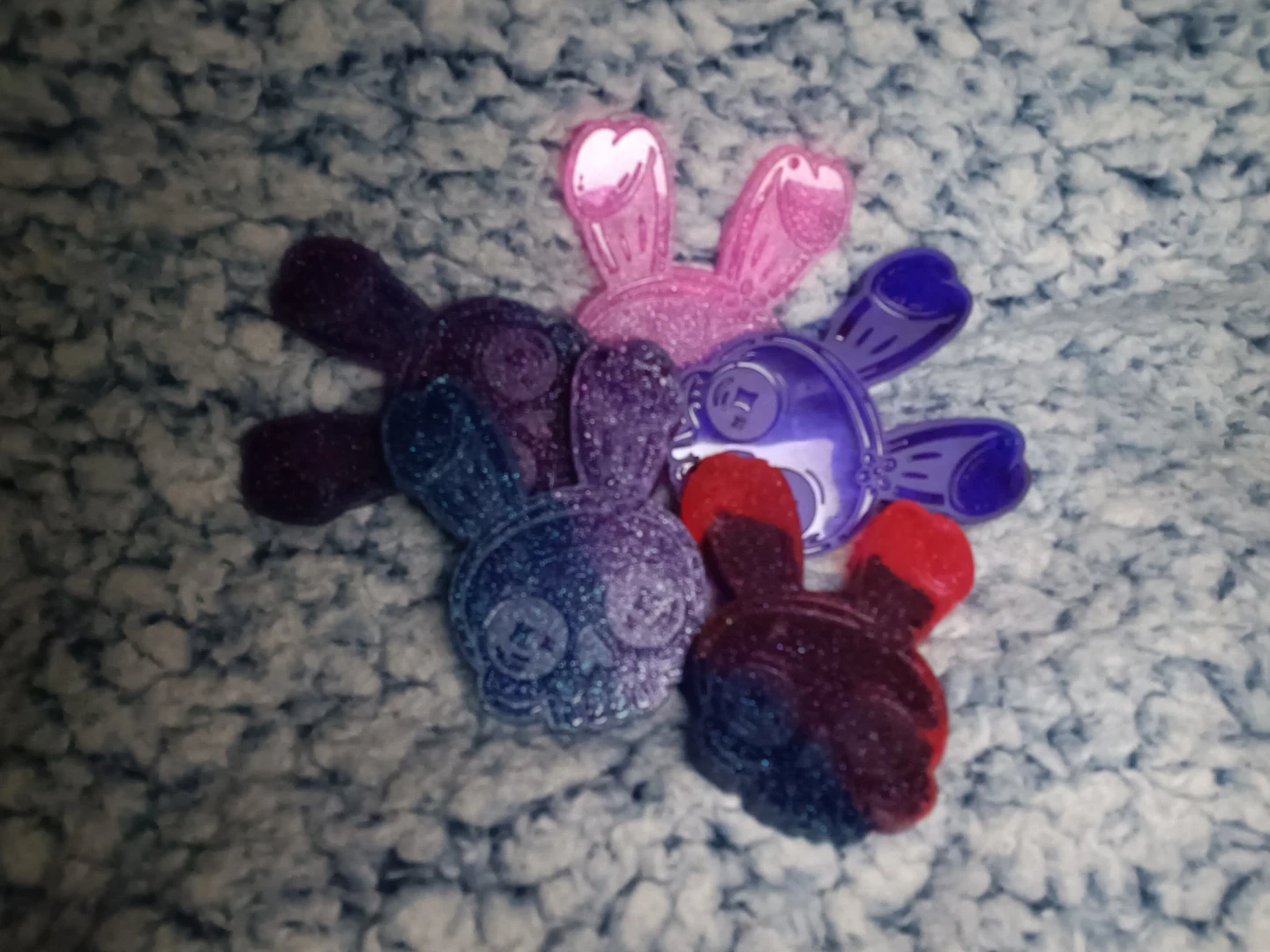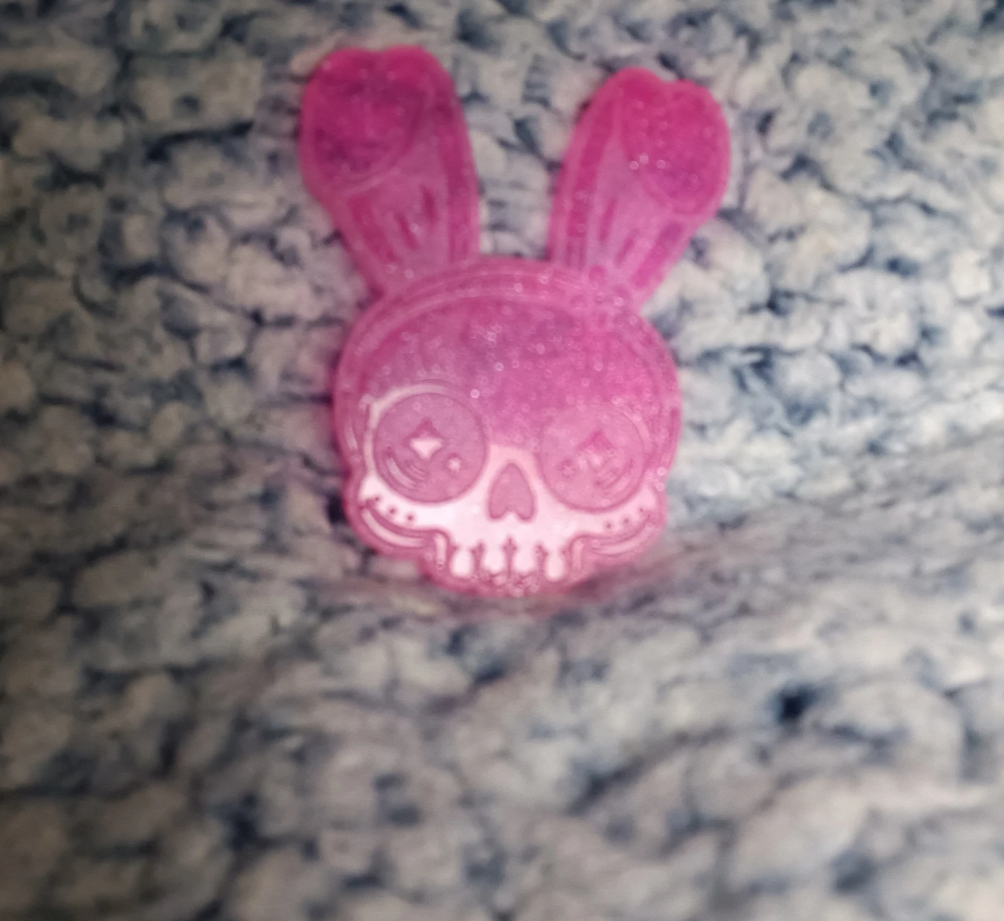 Handmade resin charms featuring a bunny skull design. Available in various sparkly colours including purple, pink, and red. These charms are great for crafts or as unique accessories!