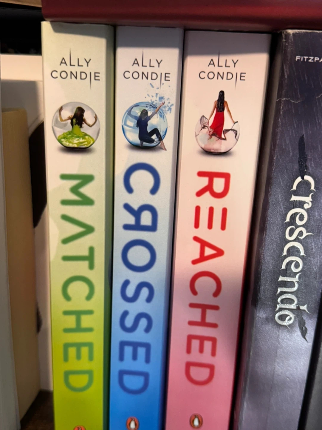 Three books from the Matched series by Ally Condie. Titles include Matched, Crossed, and Reached. Perfect for fans of dystopian young adult fiction!