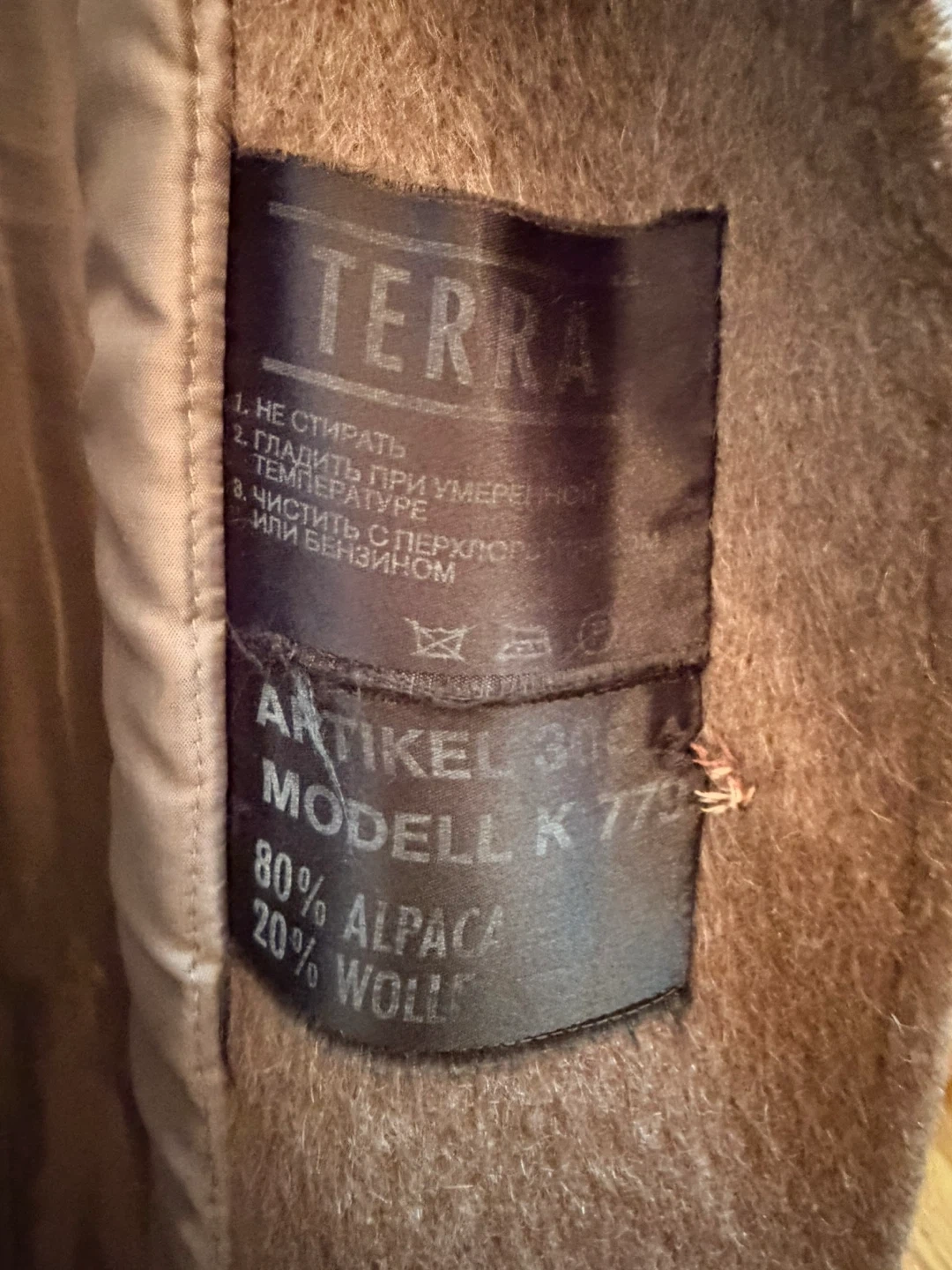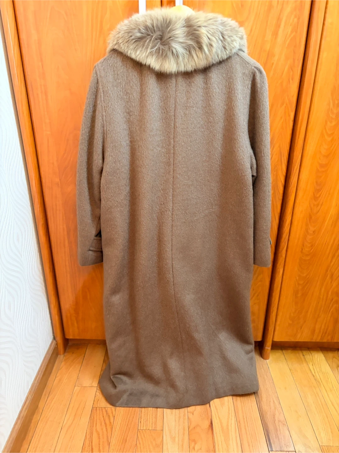 Terra brand long coat with a luxurious fur collar. It's made from an 80% alpaca and 20% wool blend. This coat offers a stylish and warm option for colder weather. Features button closure and two front pockets.