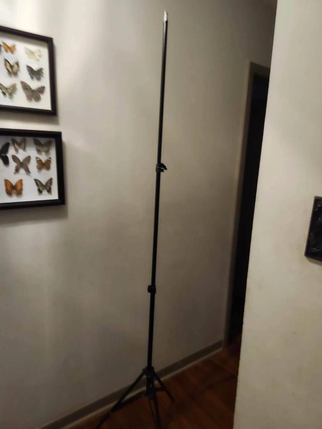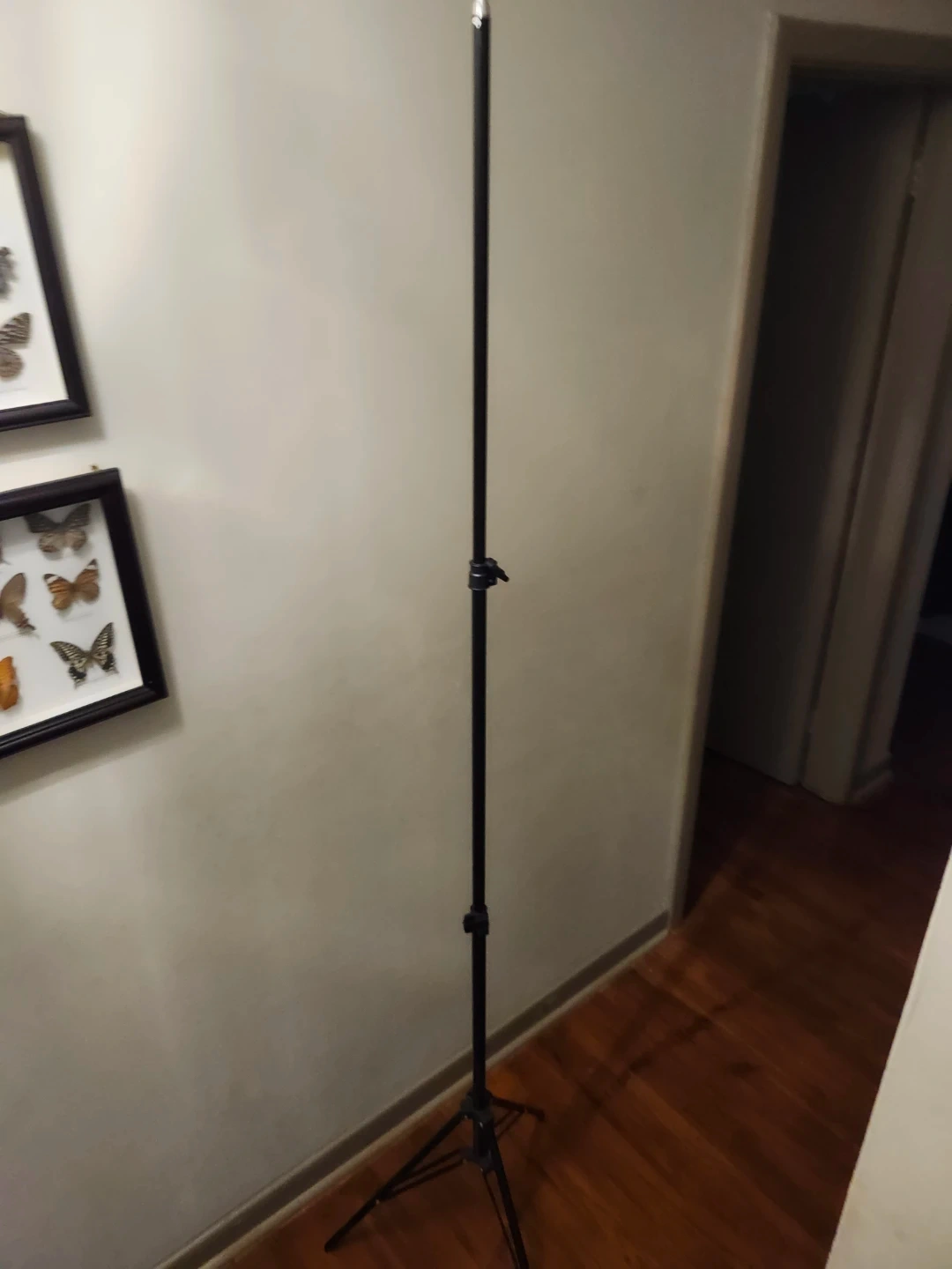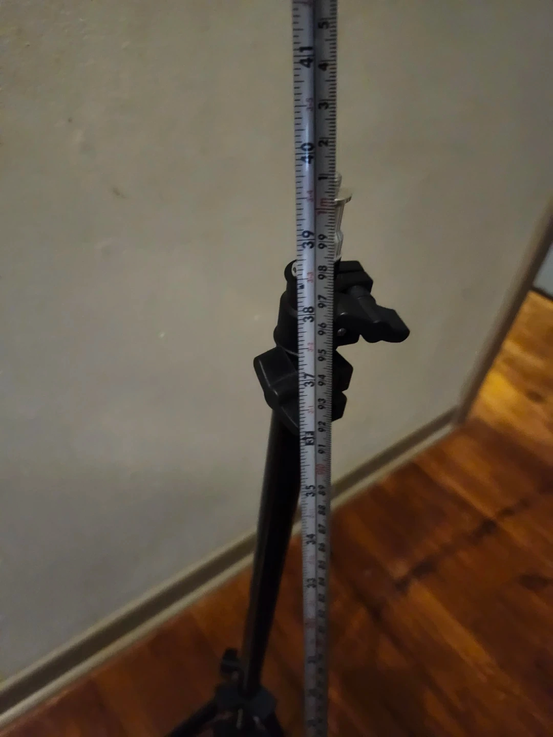 This is an adjustable stand with tripod base. It's made of black metal and features adjustable height settings. This stand is great for supporting studio lights or cameras.