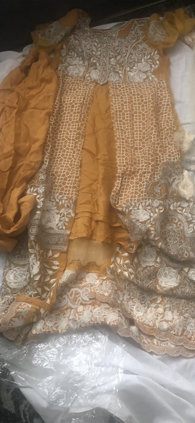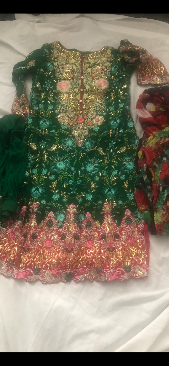 This is a collection of five beautiful, embroidered Indian suits. Includes various colours and styles. These outfits are perfect for formal events or celebrations.