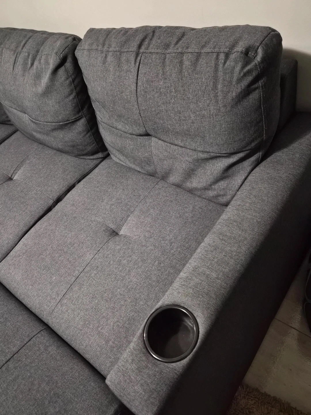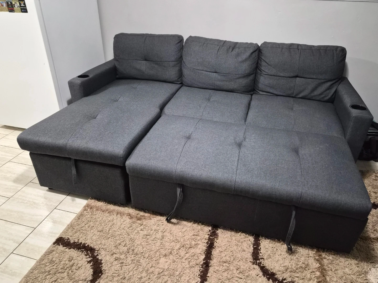 Grey sectional sofa bed that converts into a sleeping surface. Features built-in storage compartments under the seats and cup holders on the armrests. Upholstered in a durable fabric.