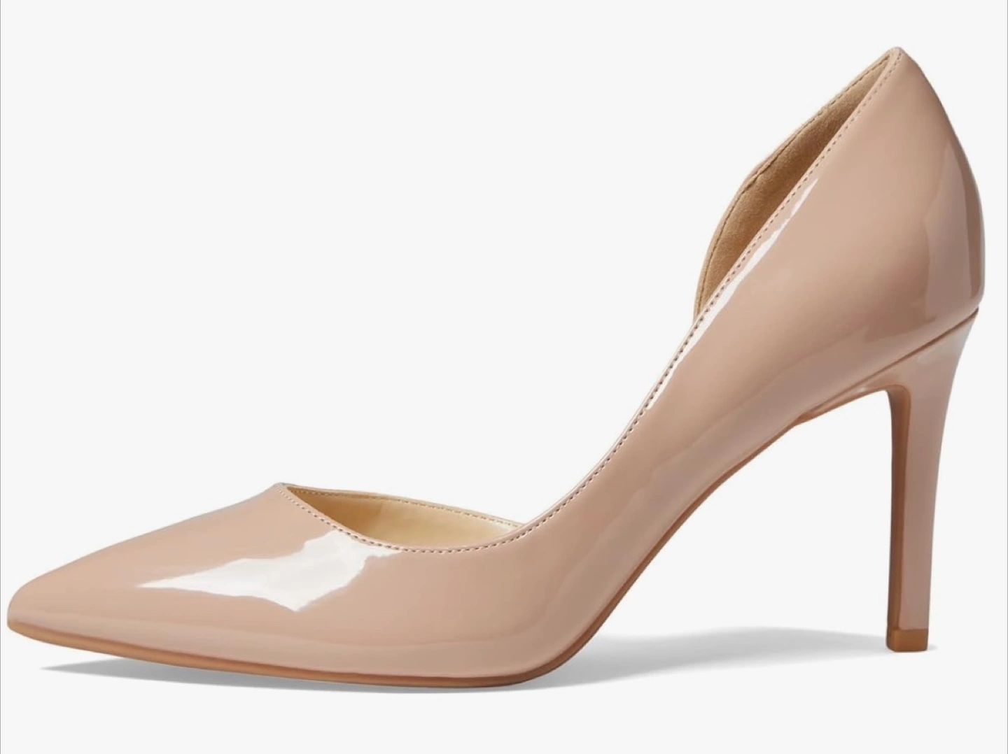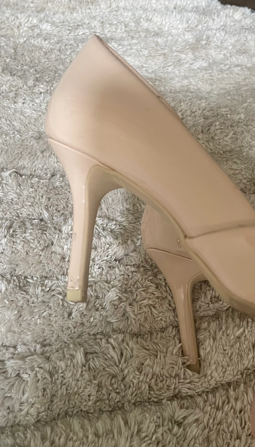 Nude patent leather heels. Pointed toe. Stiletto heel. Cut-out detail.