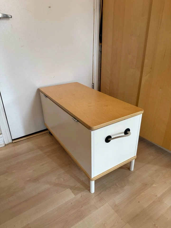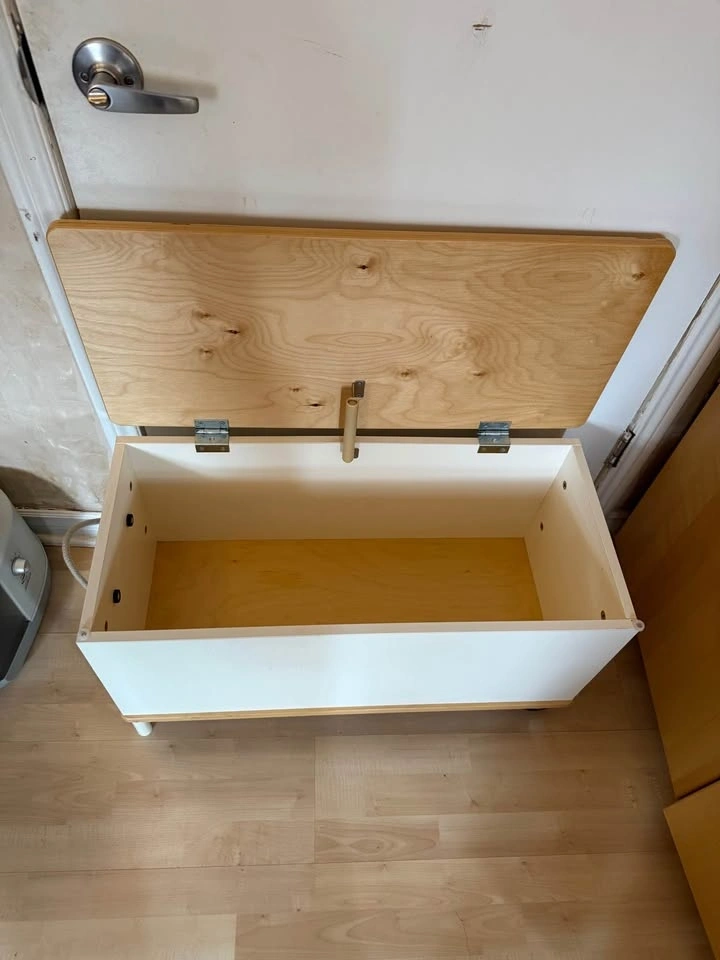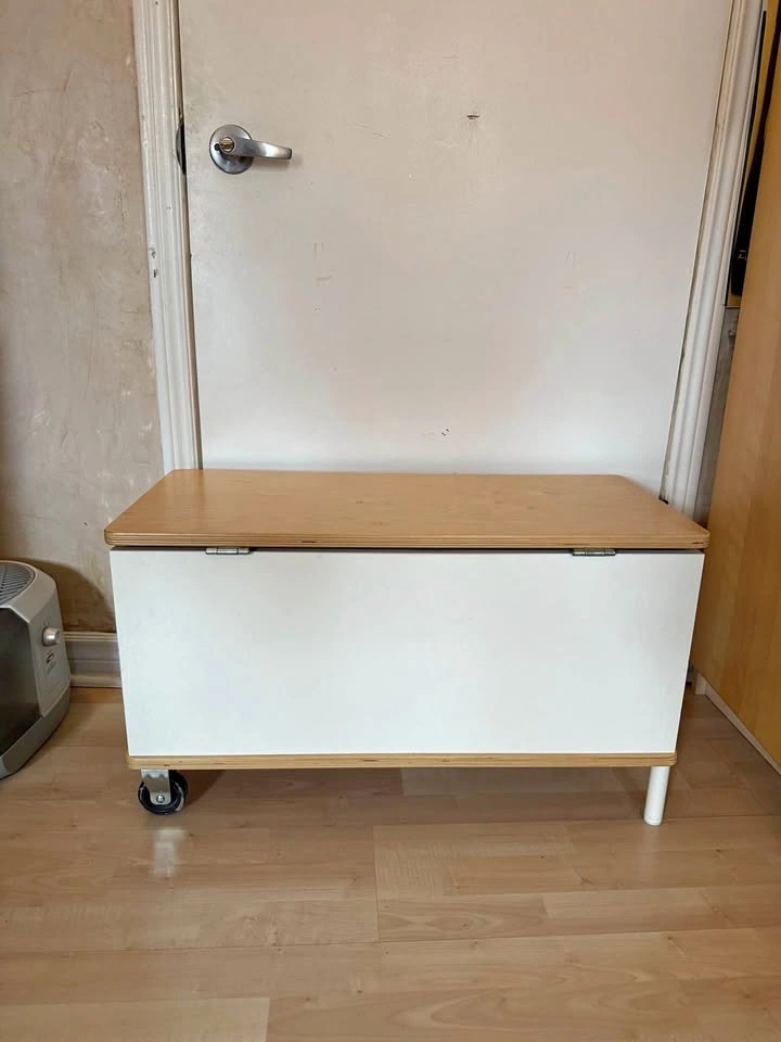 Versatile storage chest and seats. Has a plywood top and bottom, with a white body. Lid opens upwards with soft hinges. Rope handle on one side. Has wheels on one end and two legs on the other end, making it easy to move around. Good for toys, blankets, and others.