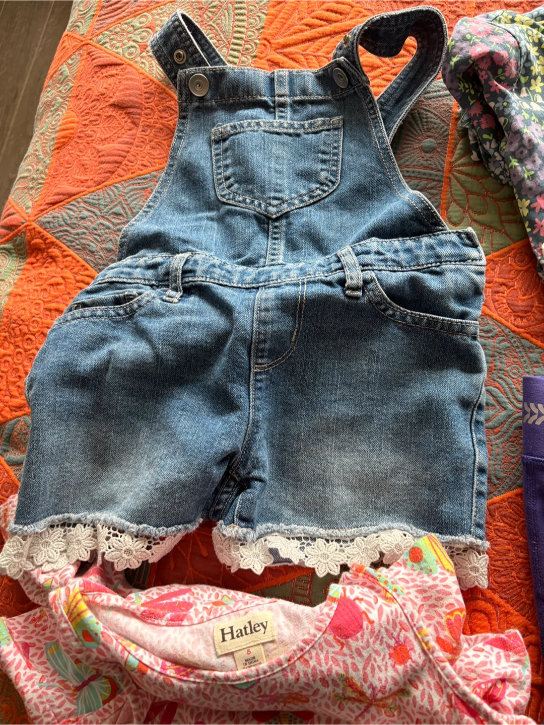 20 pieces included. Cute girls' denim overalls with lace trim. Includes a pink butterfly print top by Hatley and other assorted tops and bottoms. Perfect for everyday wear and playtime! 20 OBO
